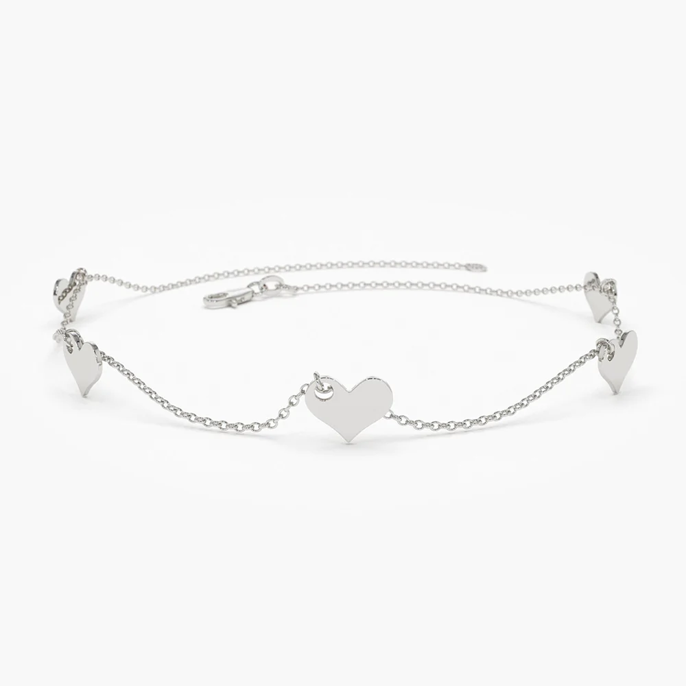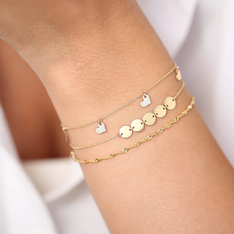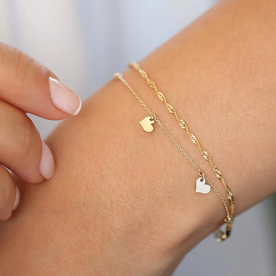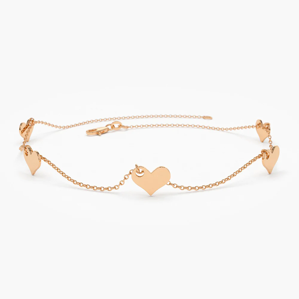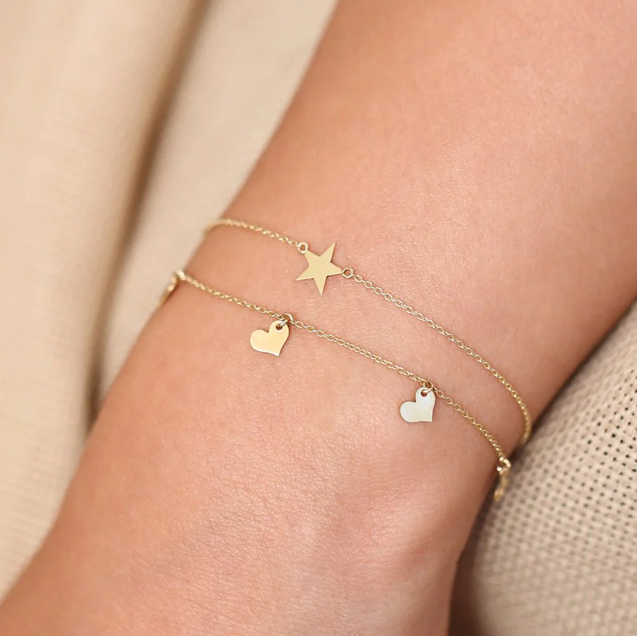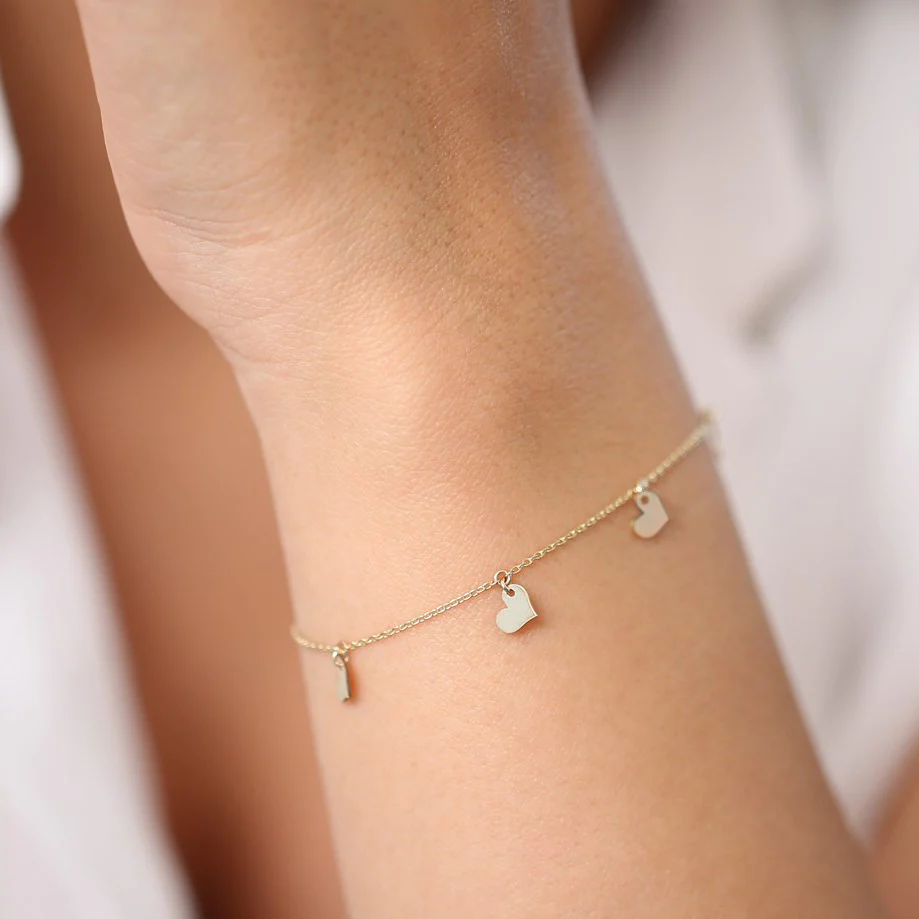 The 18k Solid Gold Dangle Heart Bracelet is a delicate and romantic piece designed to add charm and elegance to any jewelry collection. Crafted from 18k solid gold, this bracelet features dainty heart charms that gracefully dangle, creating a subtle yet eye-catching movement.