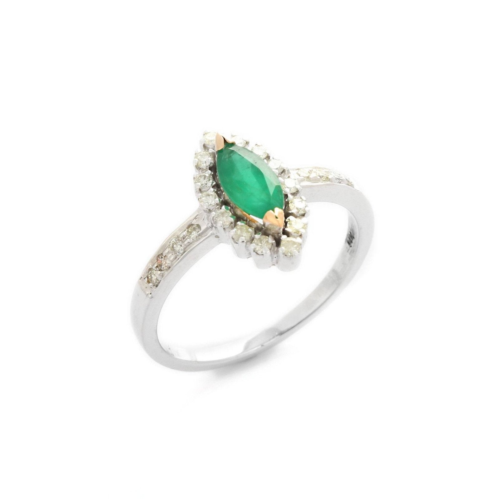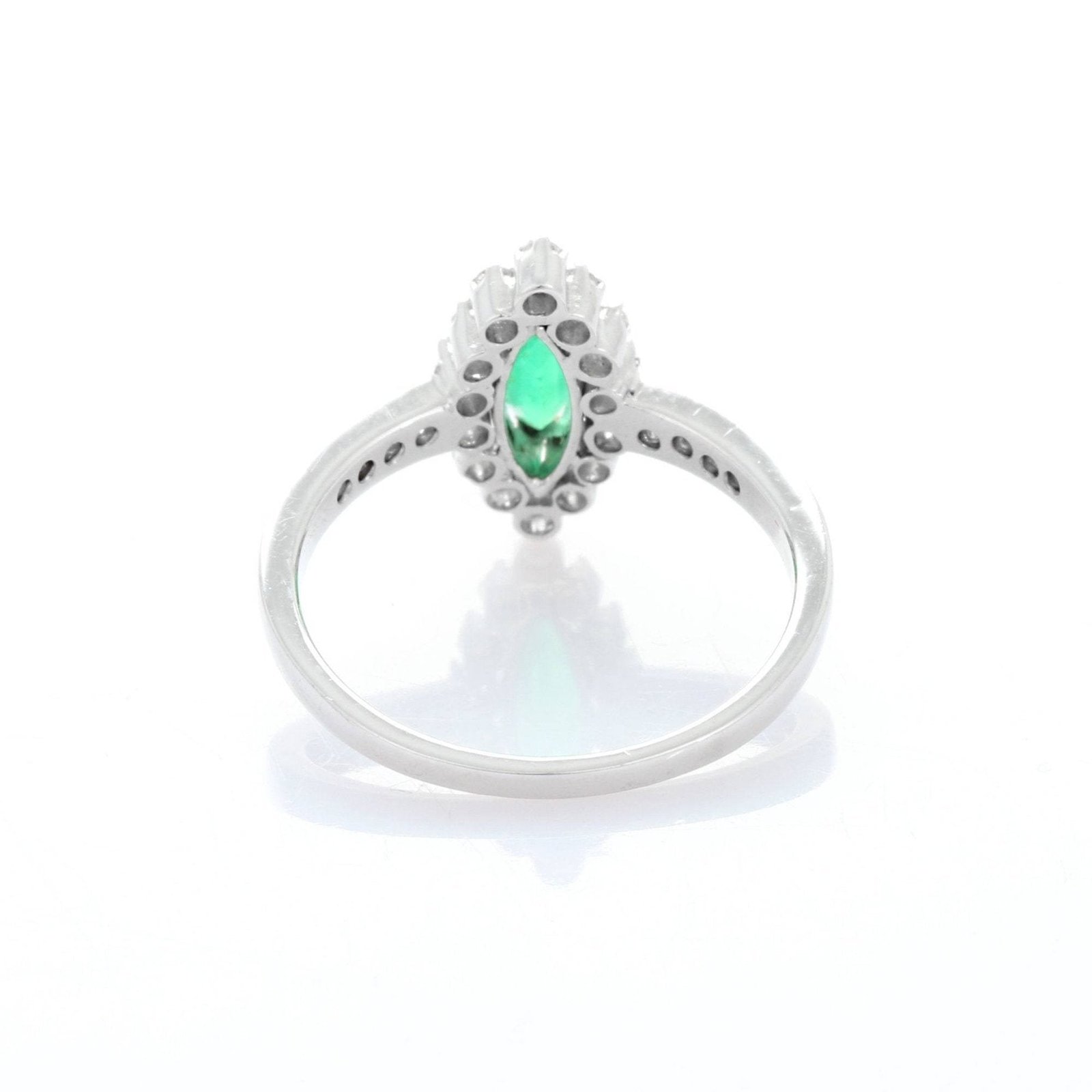 The ring’s design showcases the emerald as the centerpiece, with 28 meticulously set diamonds that enhance its natural brilliance. The marquise shape of the emerald adds a unique and sophisticated touch to the design, making this ring a versatile addition to any jewelry collection.
