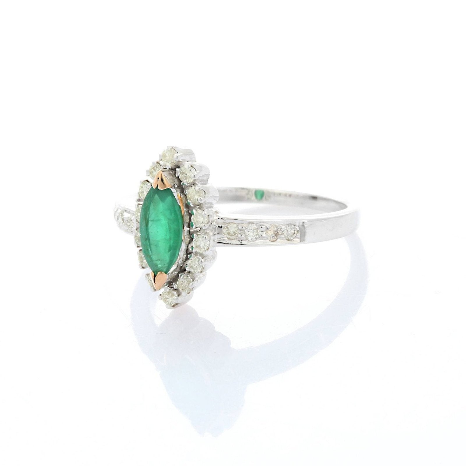 Introducing the 18k Solid Gold Emerald Ring, an exquisite piece of jewelry that combines elegance and luxury. Crafted from high-quality 18k Solid Gold, this ring features a magnificent 0.53 ct marquise-shaped emerald, measuring 8 x 4 mm. The emerald’s vibrant green hue is beautifully complemented by the surrounding 0.27 ct diamonds, adding a dazzling sparkle to the piece.