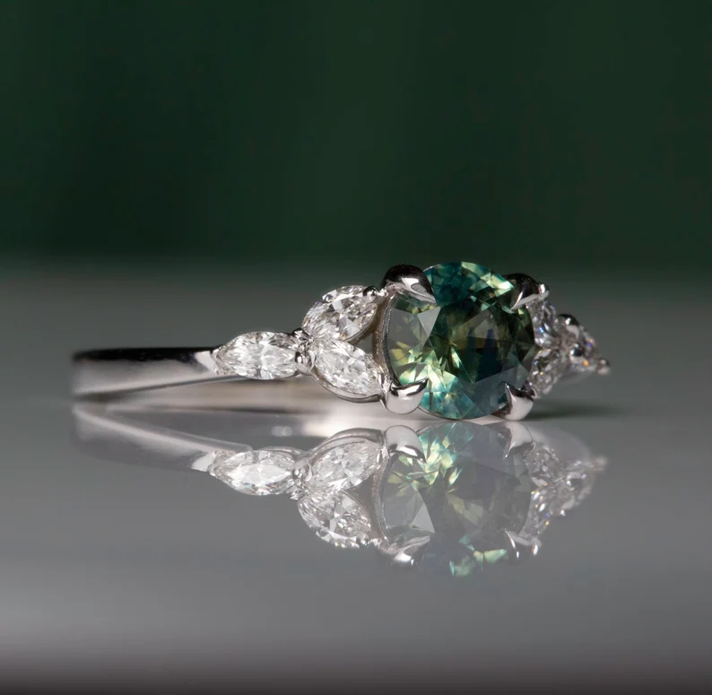 A 1-1.2 ct natural Montana sapphire ring, accented with six marquise diamonds, set in 18k solid gold. A timeless and nature-inspired treasure.