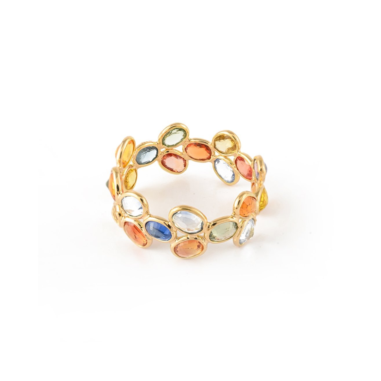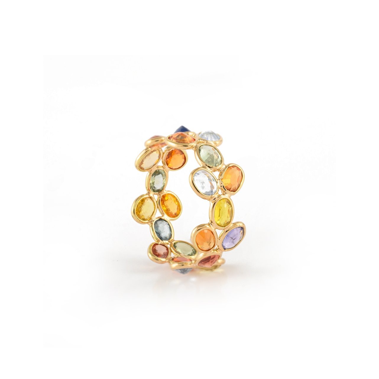 The 18k Solid Gold Multi Sapphire Eternity Band is a stunning piece that beautifully highlights the colorful allure of multi sapphires. This elegant band features 22 oval-shaped sapphires, totaling 4.81 carats. The oval cut enhances the sapphires’ natural brilliance and adds a sophisticated, elongated look.