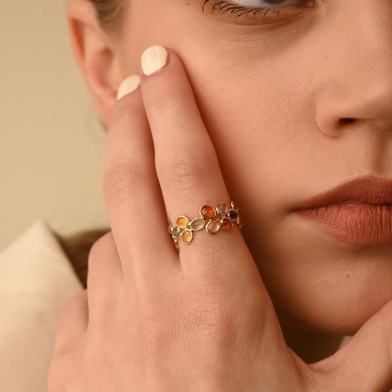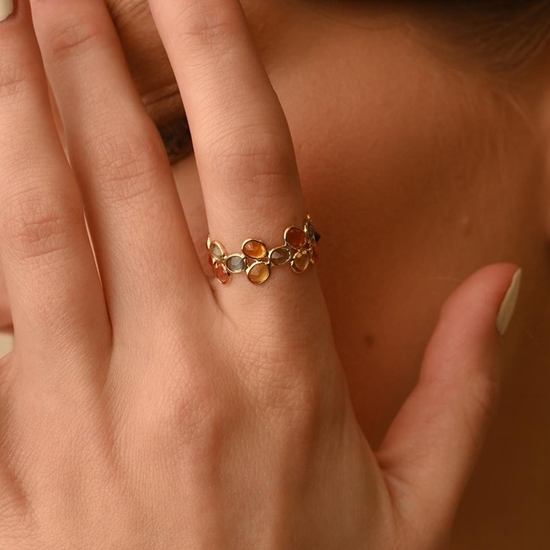 Crafted from 18k Solid Gold, the band provides a rich and warm backdrop that enhances the vibrant hues of the sapphires. Each gemstone is set in a bezel setting, which not only secures the stones but also showcases their vivid colors and natural sparkle. The bezel setting contributes to a smooth, sleek finish, adding to the band’s overall elegance.