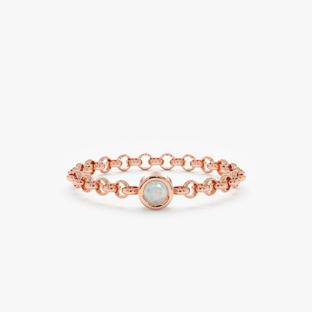 “A delicate 18k solid gold chain ring featuring a vibrant opal, offering a minimalist and elegant design perfect for stacking or everyday wear.