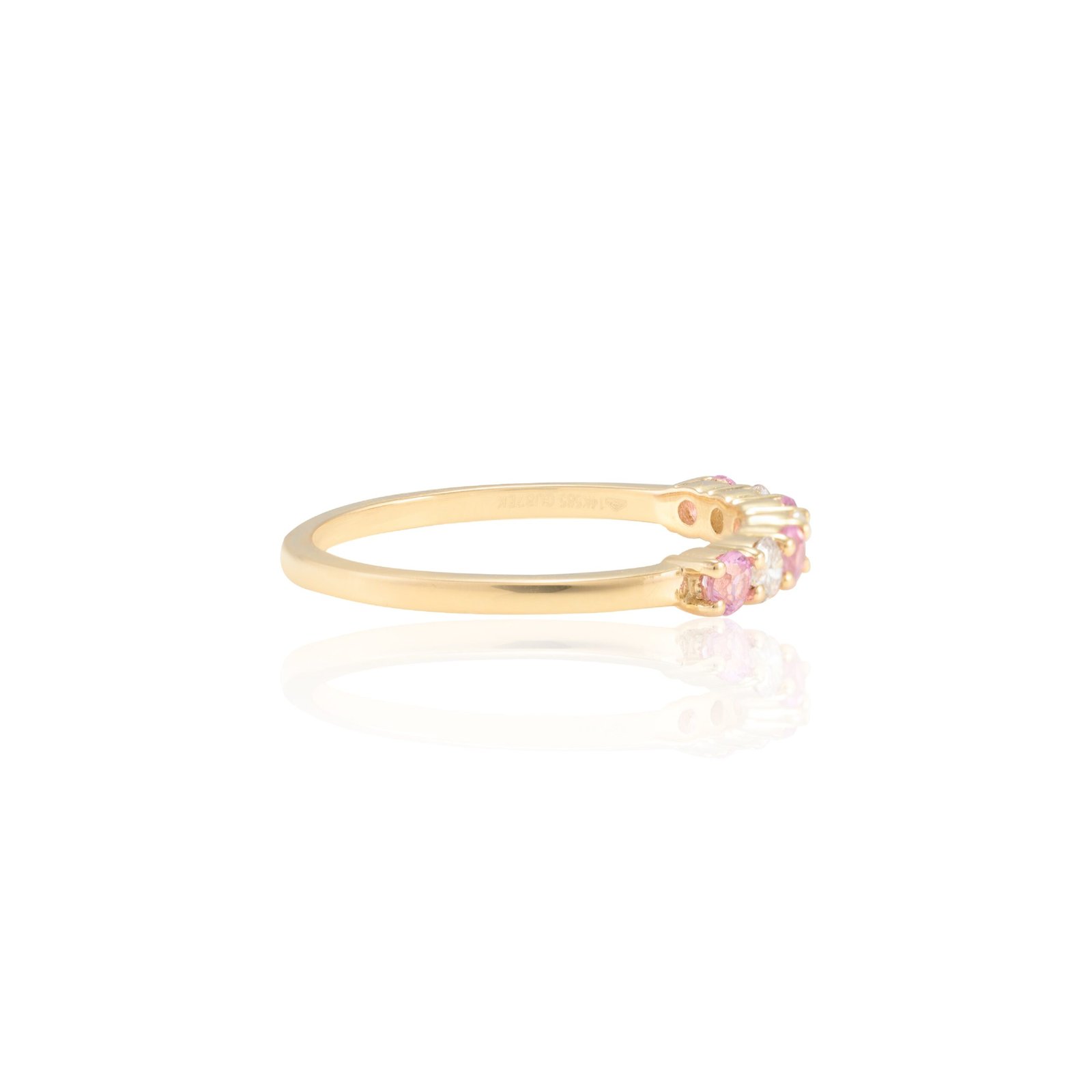 Weighing 1.79 grams, this half eternity band offers a lightweight yet luxurious feel, making it ideal for everyday wear or special occasions. The shank, measuring 1.4 mm in width, provides a delicate and refined appearance that sits gracefully on the finger. The elegant design ensures that the pink sapphires and diamonds remain the focal points, allowing their beauty to shine through.