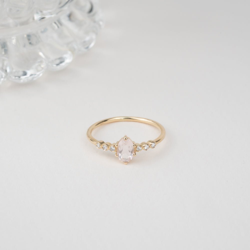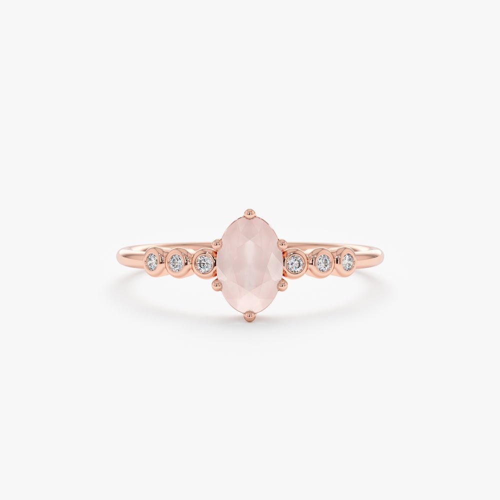 18k Gold Rose Quartz and Diamond Engagement Ring featuring a 6×4 mm prong-set quartz and 0.06 ctw of natural diamonds.