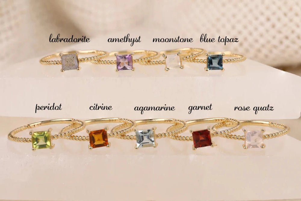 A captivating 18k solid gold square labradorite ring, featuring a shimmering labradorite stone in a sleek and modern design for a unique look.