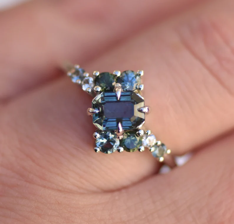 18K Solid Gold Teal Sapphire Cluster Ring