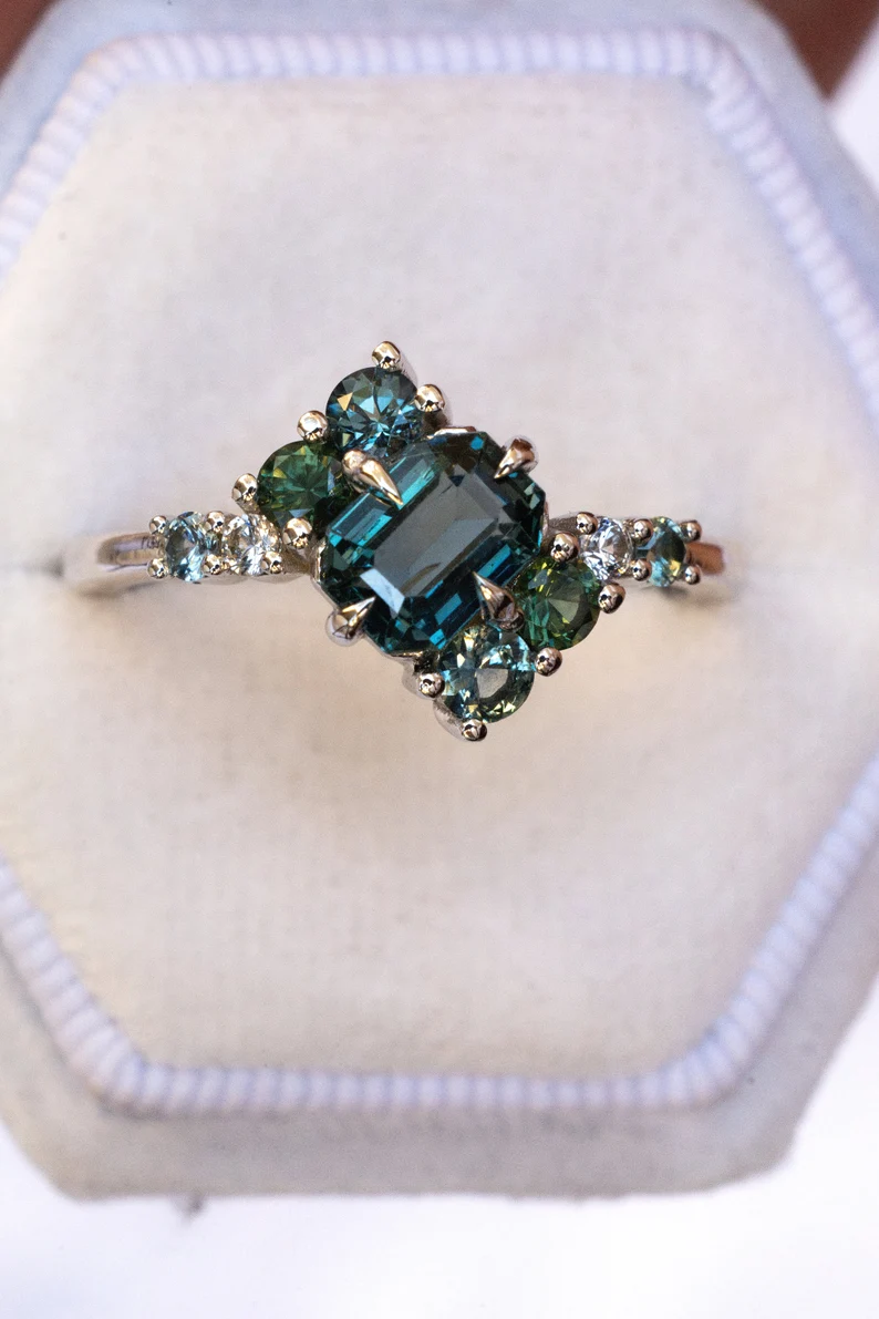 Whether you’re drawn to its celestial beauty or its distinctive color palette, this teal sapphire engagement ring is a true celebration of individuality and love.