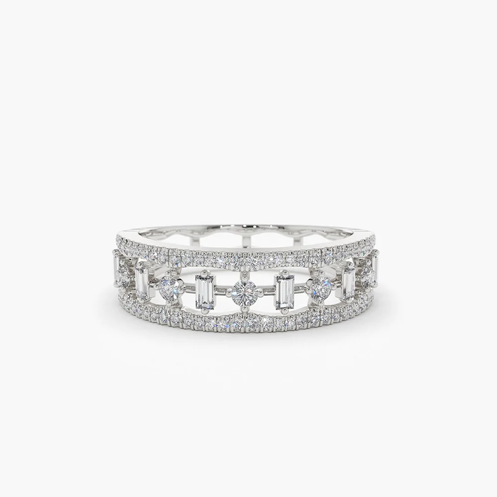 Because the design incorporates round and baguette diamonds in an intricate yet balanced pattern, this ring undoubtedly stands out for its unique beauty.