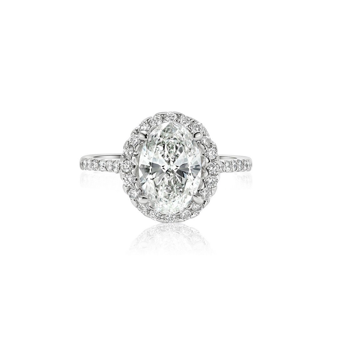 18k White Gold GRA Certified Moissanite Diamond Oval Shape Halo Ring (2 CT, D)