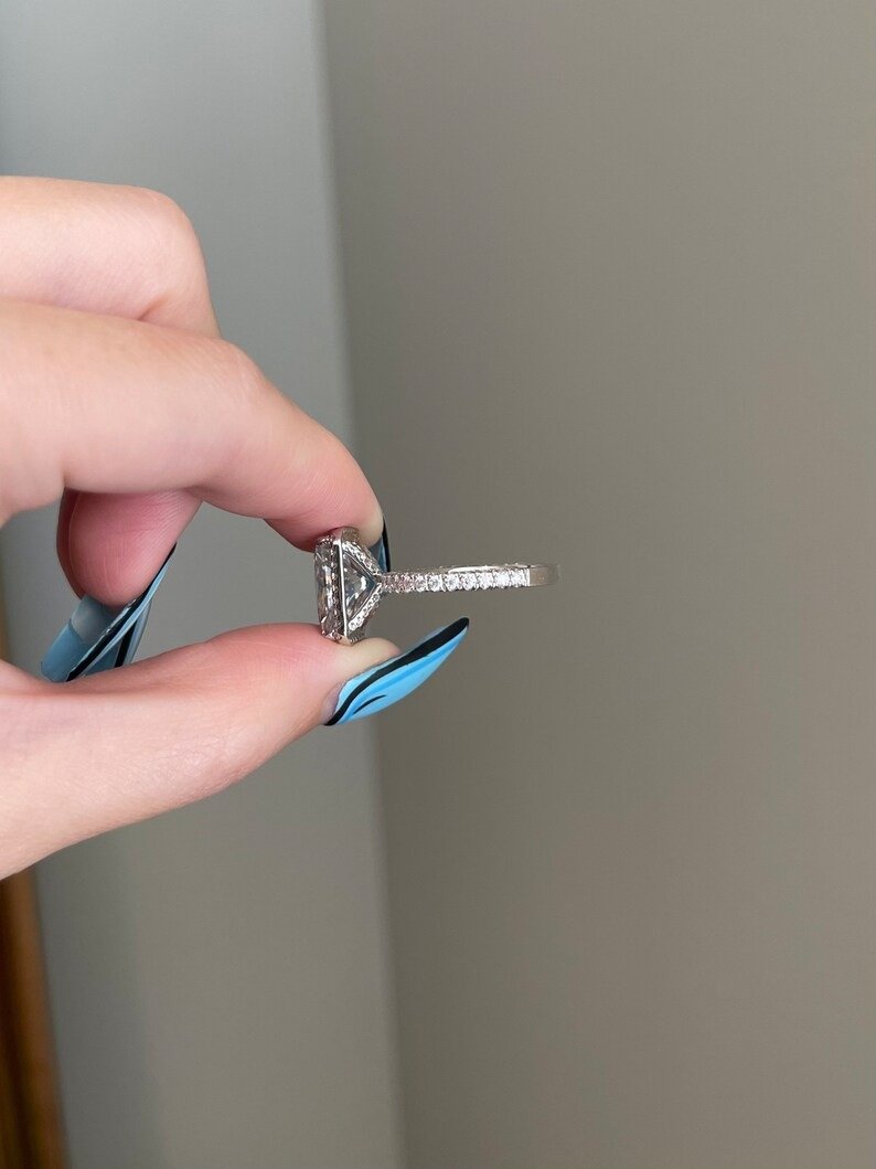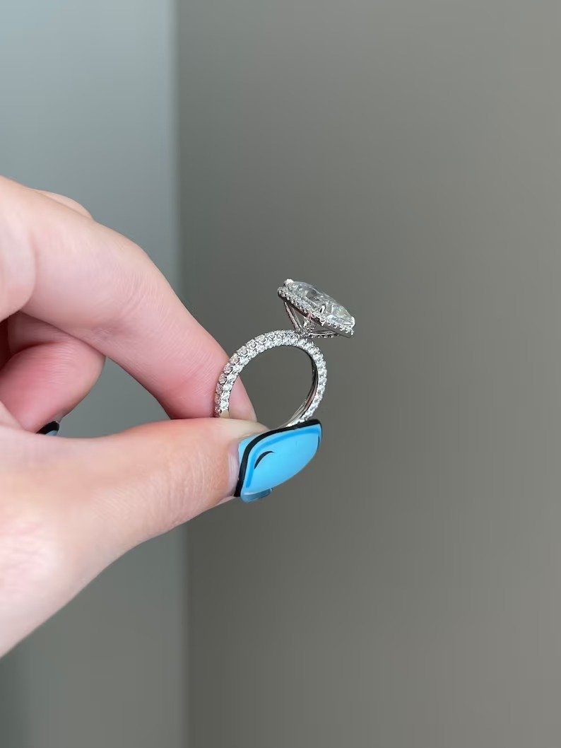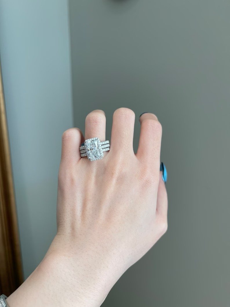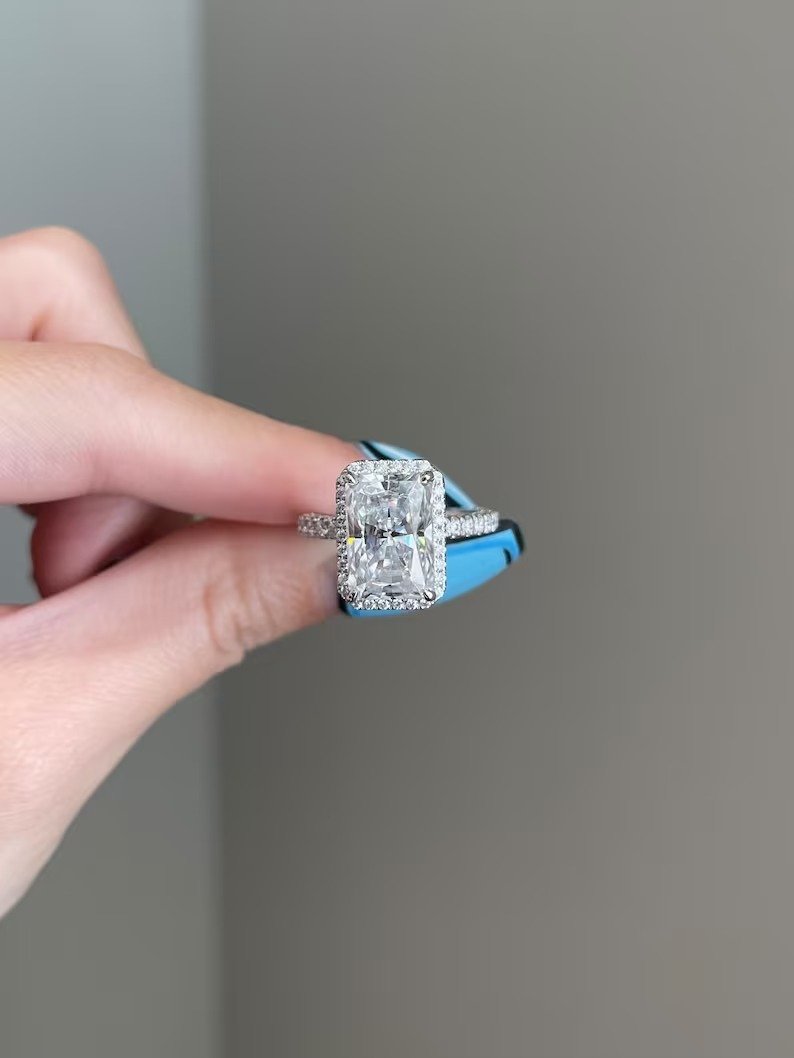 This 6ct radiant crushed ice moissanite ring features a halo, pavé basket, and triple pavé band—crafted for bold brilliance and showstopping elegance.