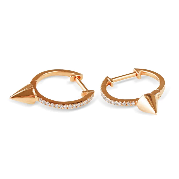 It features the new Avery Natural Diamond Spike Huggies, offering a fine balance of a modern edgy vibe and classic glamour. From quality 18k gold, it includes distinctive and aggressive style spiked earring spikes, which enhance any fashion with a bit of added confidence. They have intricate detail and finish for versatility both in formal and casual functions.