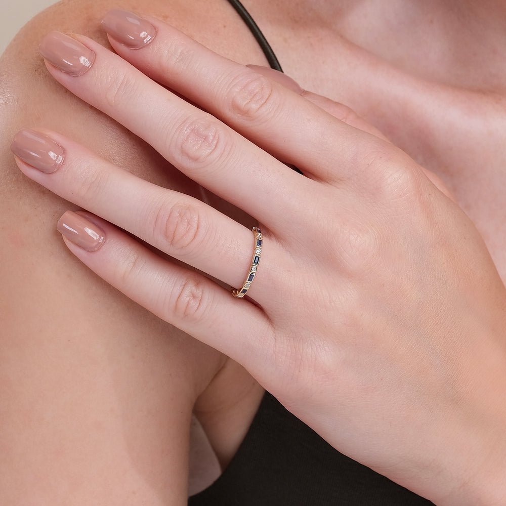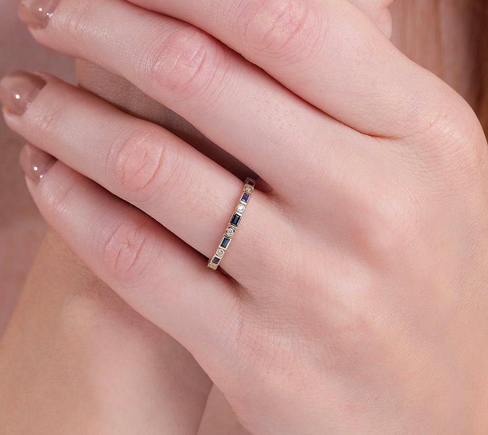 Indulge in the timeless allure of our 14K Solid Gold Diamond and Baguette Sapphire Eternity Ring, meticulously crafted to capture the essence of refined sophistication and enduring beauty. This exquisite eternity ring is expertly designed with alternating baguette sapphires and round diamonds, each meticulously bezel-set in lustrous solid gold.