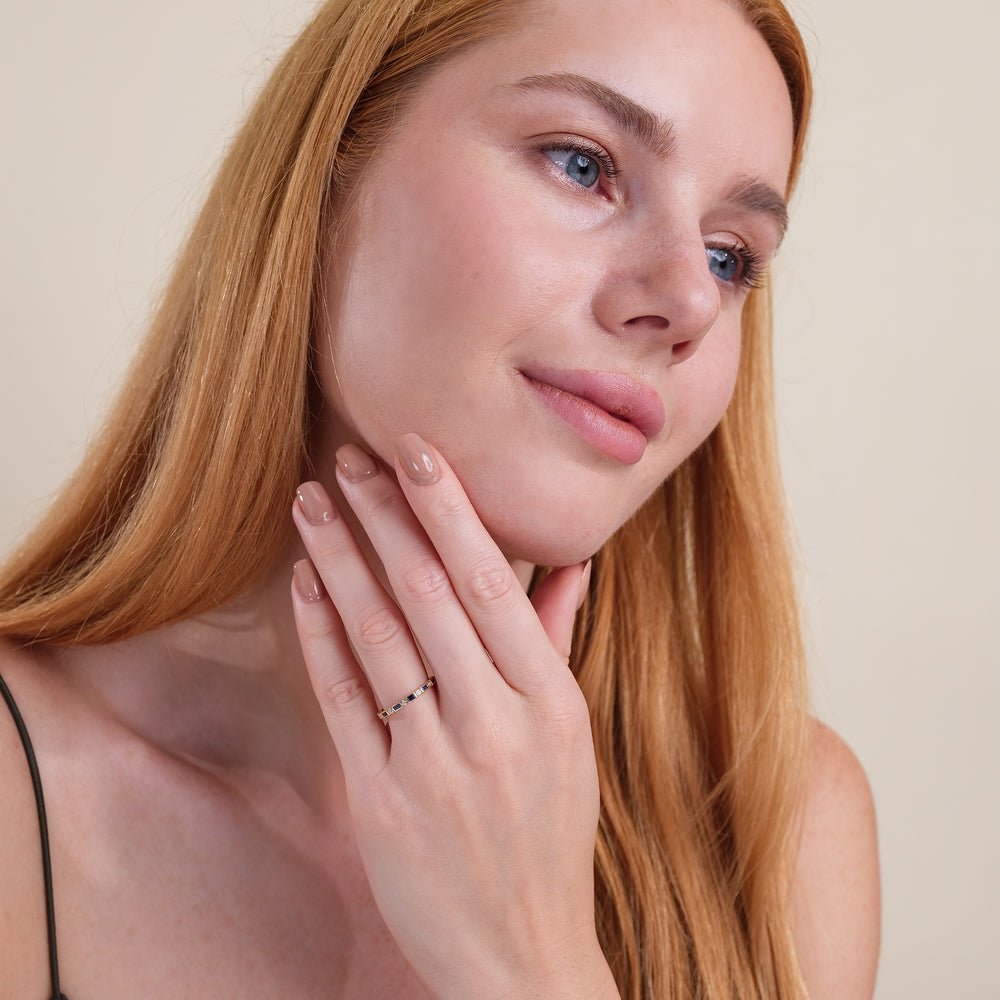 Perfect as a September birthday gift or a meaningful token of affection, this dainty ring is a testament to exquisite craftsmanship and the enduring appeal of precious gemstones. Whether worn alone as a statement piece or paired with other rings for a personalized stack, this eternity ring radiates effortless sophistication and style.