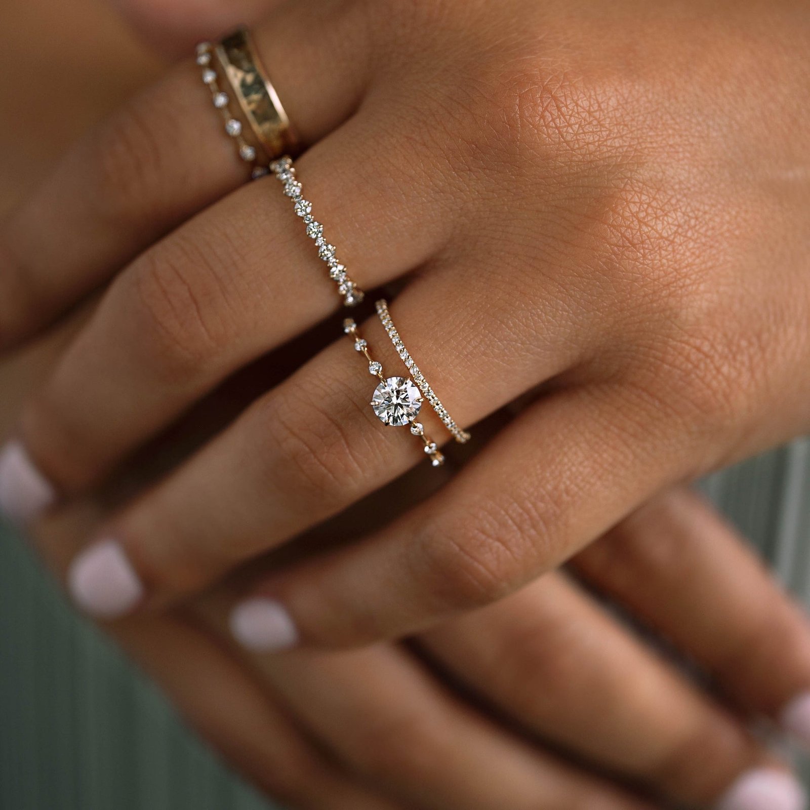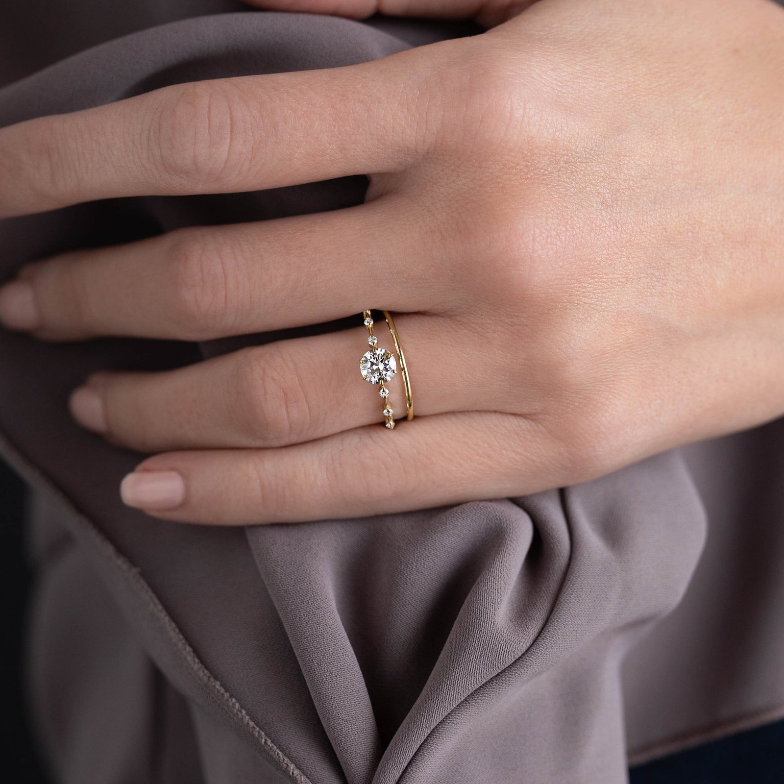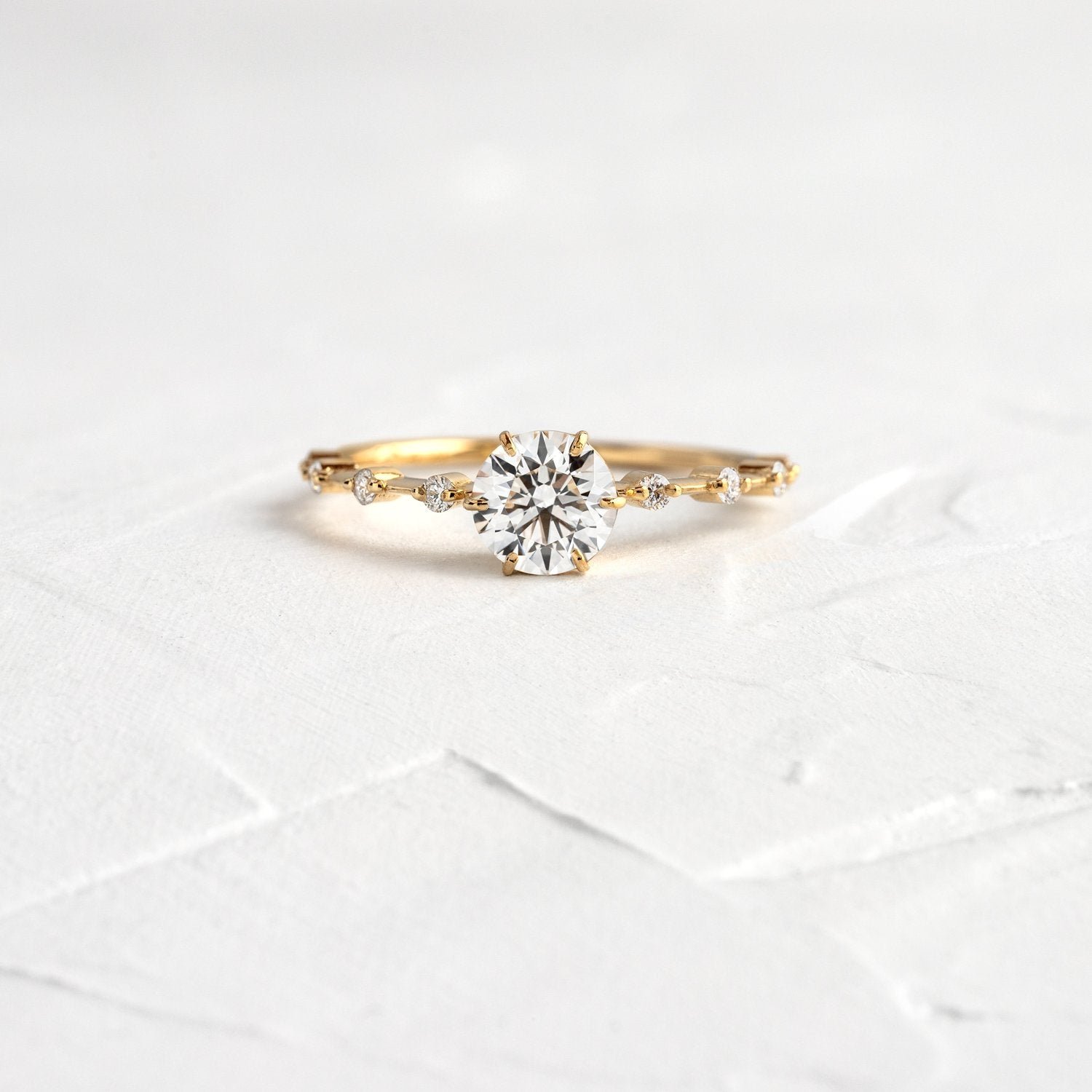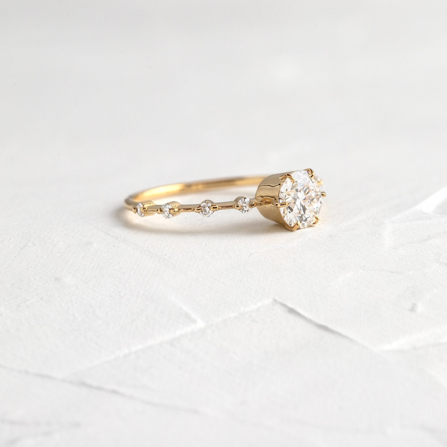This 18k gold Diamond Distance Ring features spaced moissanite diamonds in a sleek design—perfect for a contemporary, elegant engagement ring.