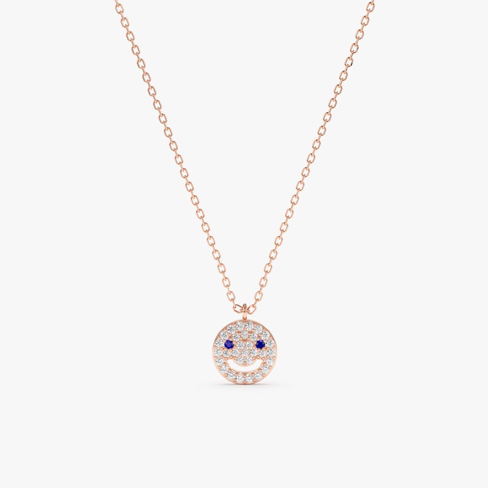 Brighten your day with our Solid Gold Diamond & Blue Sapphire Happy Face Necklace. Handmade with love, featuring sparkling diamonds and vibrant sapphires in a charming smiley face design.