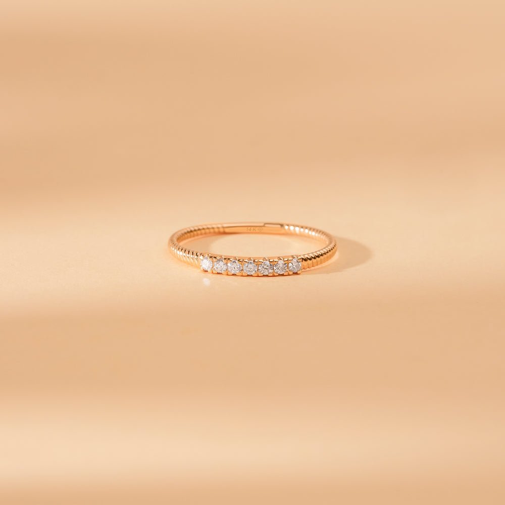 Elegantly detailed and rich in texture, the Natural Diamond Textured Rope Band combines artisanal craftsmanship with timeless design. Crafted in 14K solid gold, this unique ring features a beautifully twisted rope pattern that symbolizes unity and strength—perfect for marking special moments or adding character to your everyday stack. The band’s tactile texture is complemented by a linear row of natural diamonds set into a sleek gold bar, bringing just the right amount of shimmer to the intricate design.
