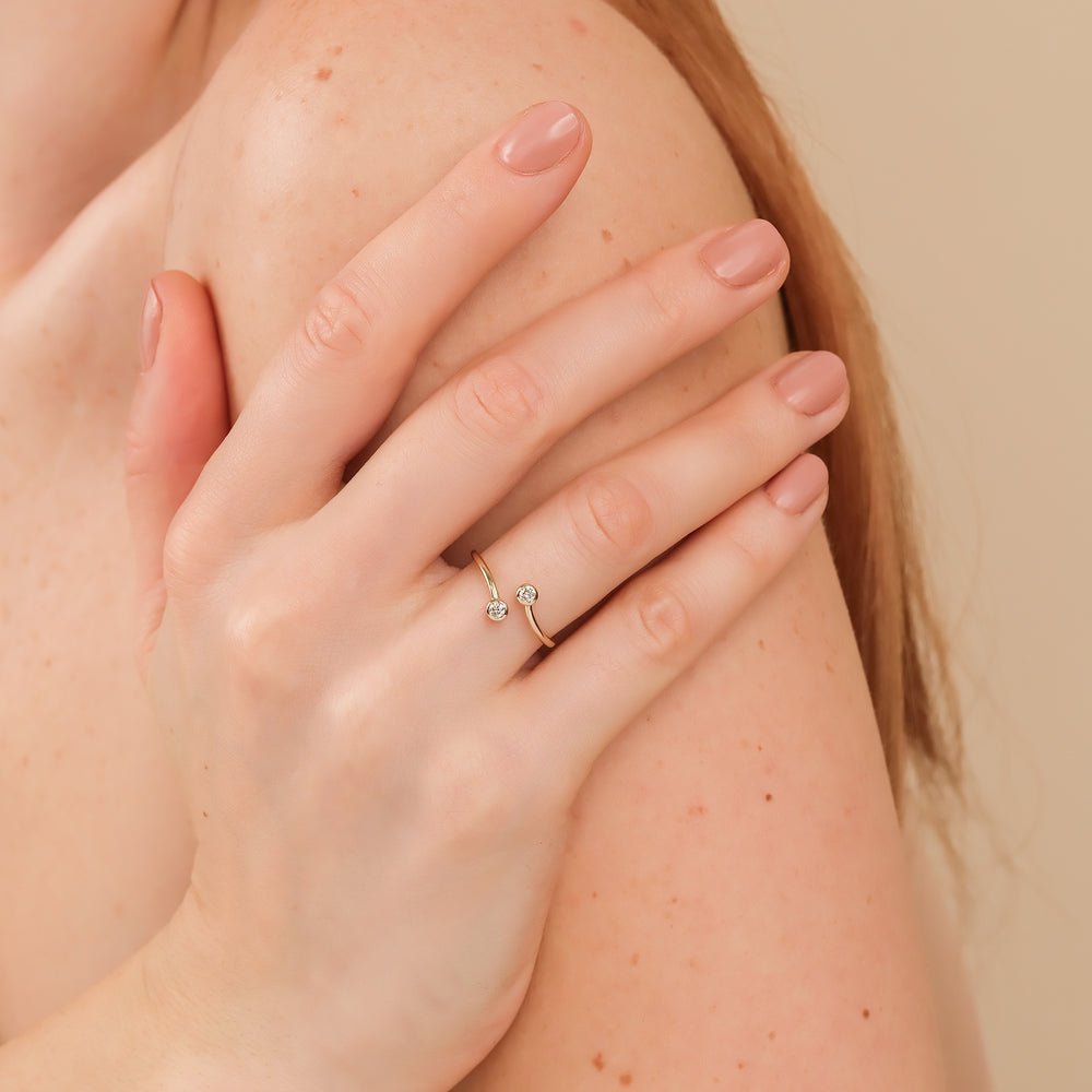 Dainty 14K gold open cuff ring with bezel-set natural diamonds (0.06ct). A minimalist statement piece for everyday luxury.