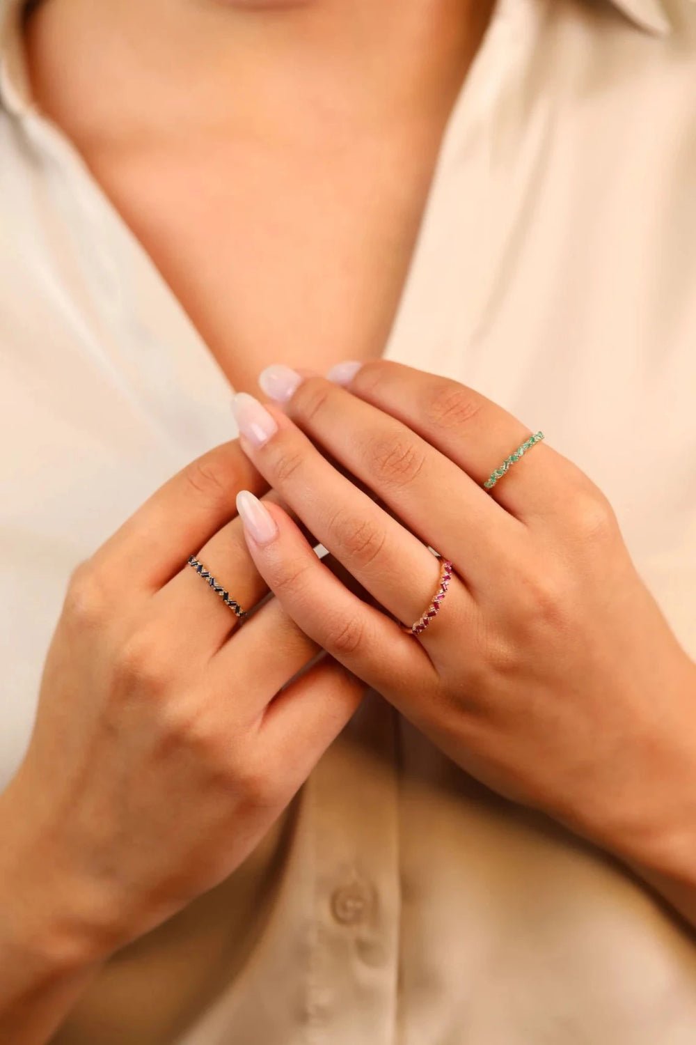 Celebrate timeless beauty and nature-inspired elegance with the 14K Solid Gold Emerald and Diamond Garland Ring. Designed to resemble a delicate wreath of shimmering leaves, this exquisite piece features alternating natural emeralds and diamonds, forming a graceful garland across your finger. The vibrant 0.27 ctw of emeralds brings rich green hues, while 0.13 ctw of diamonds—graded GH color and VS-SI clarity—add dazzling brilliance and contrast. The setting’s refined dimensions—2.5 mm wide and 2.4 mm high—create a balanced silhouette that’s graceful and refined.