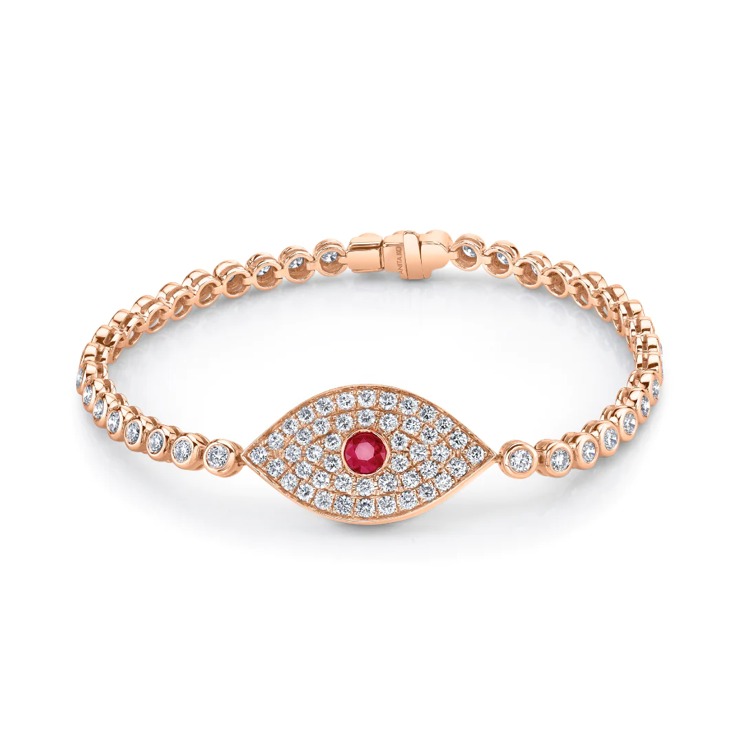 Elegant 14K solid gold evil eye bracelet featuring a vivid ruby center, blending protection with bold, timeless style.