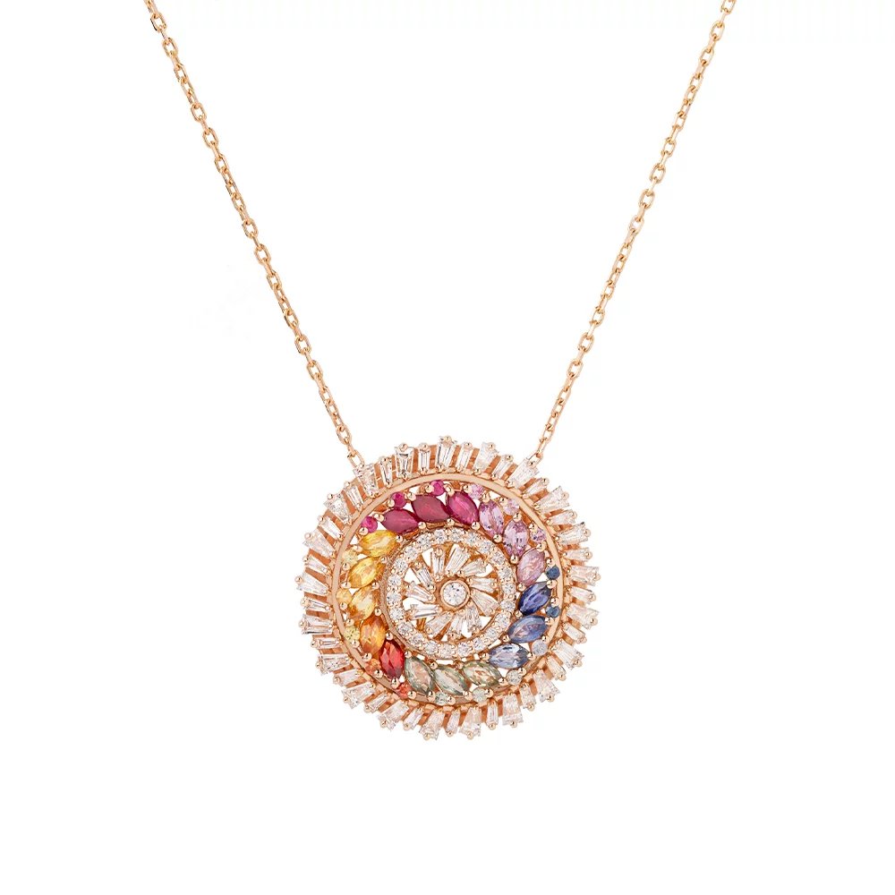 This beautiful piece is made from 14K solid gold and features an incredible arrangement of sparkling white diamonds and multicolor sapphires.