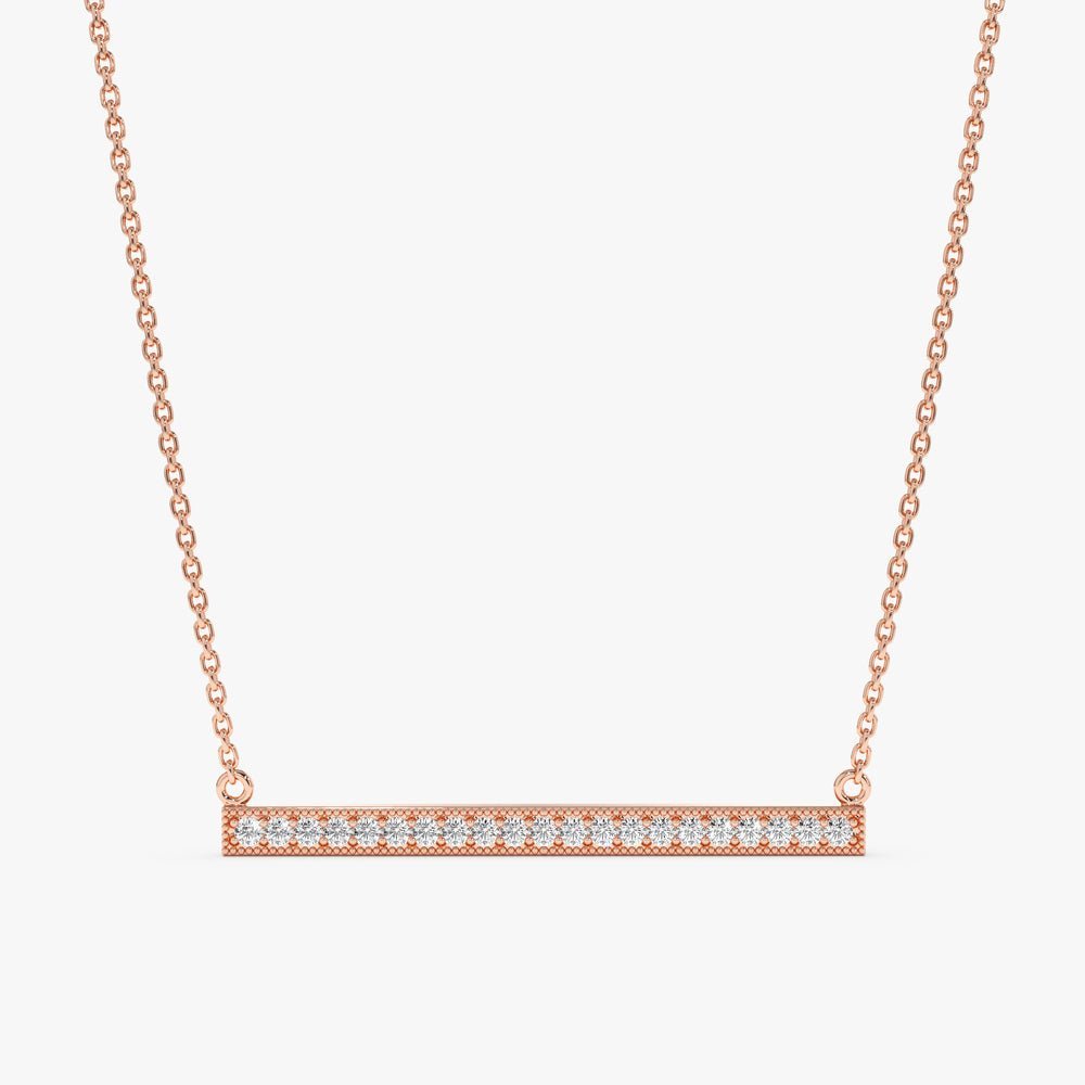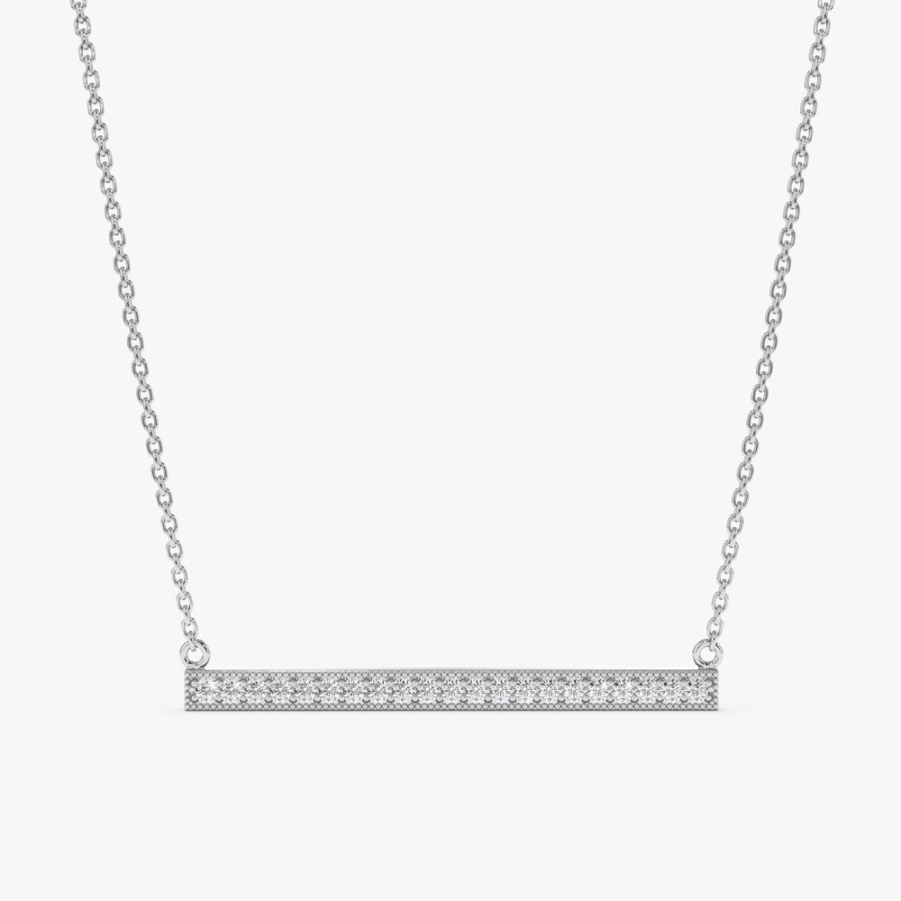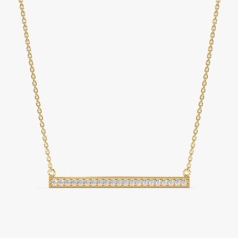 Adorning the bar pendant are sparkling round diamonds, set in a pave setting. The natural diamonds, graded G color and SI Clarity, create a dazzling display of brilliance that catches the light beautifully.