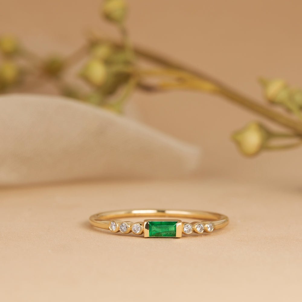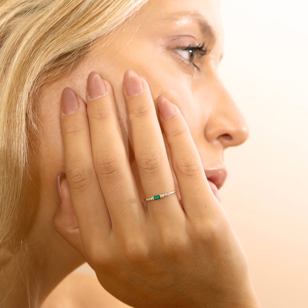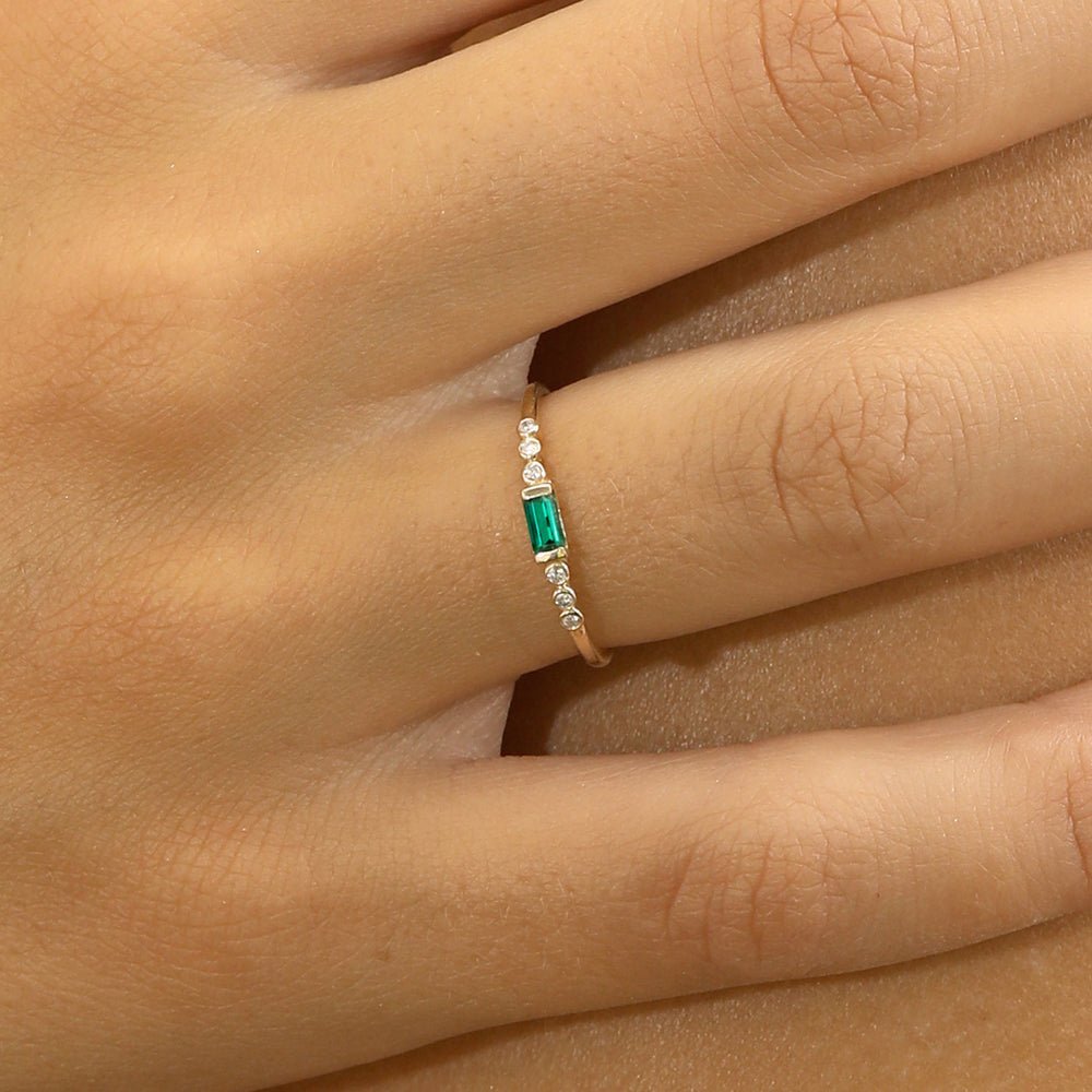 The vibrant emerald takes center stage, framed by GH color and VS-SI clarity diamonds that provide just the right contrast to highlight its depth and brilliance. Whether gifted as a promise ring, worn as a birthstone piece, or added to a curated stack, this design offers versatility with a luxurious touch.