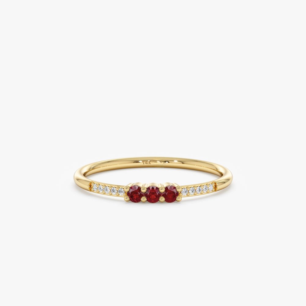 14K gold ruby and diamond ring featuring 0.09 ctw ruby and 0.05 ctw GH/VS-SI diamonds. GIA certified with a 1.3 mm band.