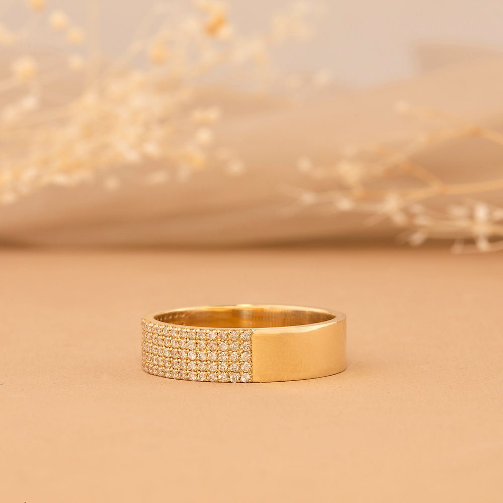 Bold 14K solid gold cigar band with 0.35 ctw pavé-set diamonds. 5.5 mm wide, GIA certified, available in yellow, white, or rose gold.