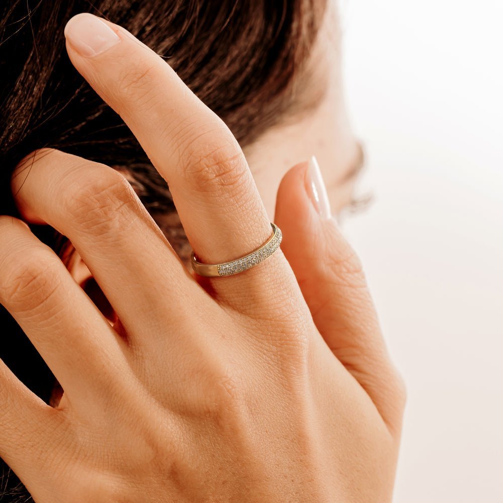 With a band width of 3 mm and a height of 1.6 mm, this ring offers a smooth yet substantial profile that fits comfortably for all-day wear. The pavé setting creates a seamless surface of brilliance across the domed contour, giving it a refined, high-end finish that complements both casual and formal looks. Whether worn solo or layered with other bands, it adds texture and shine in a distinctive, wearable form.