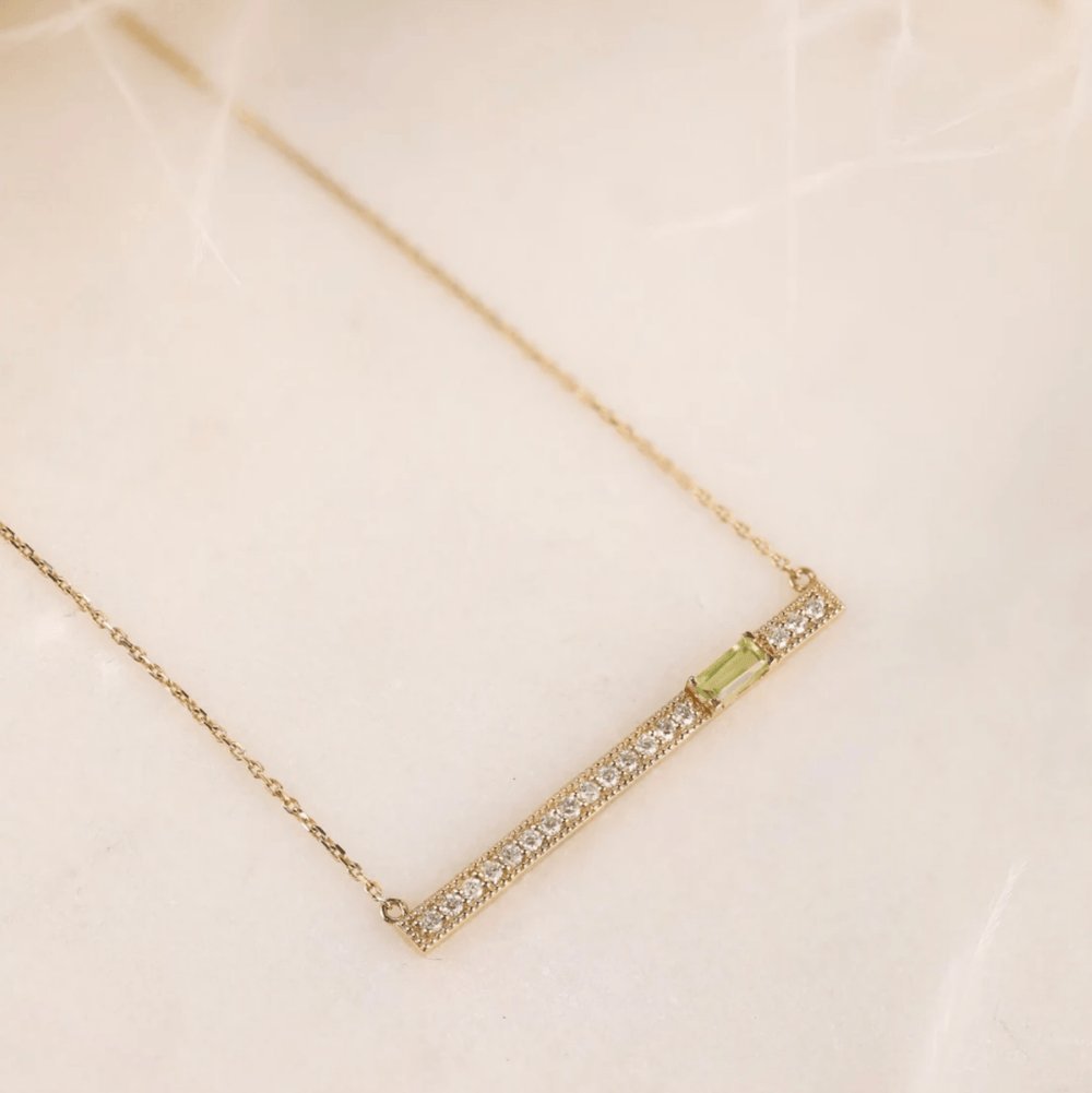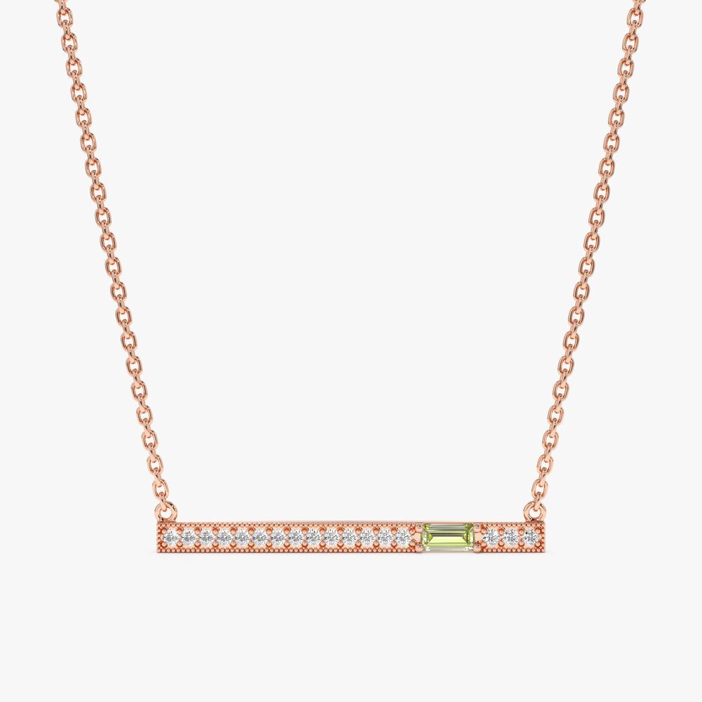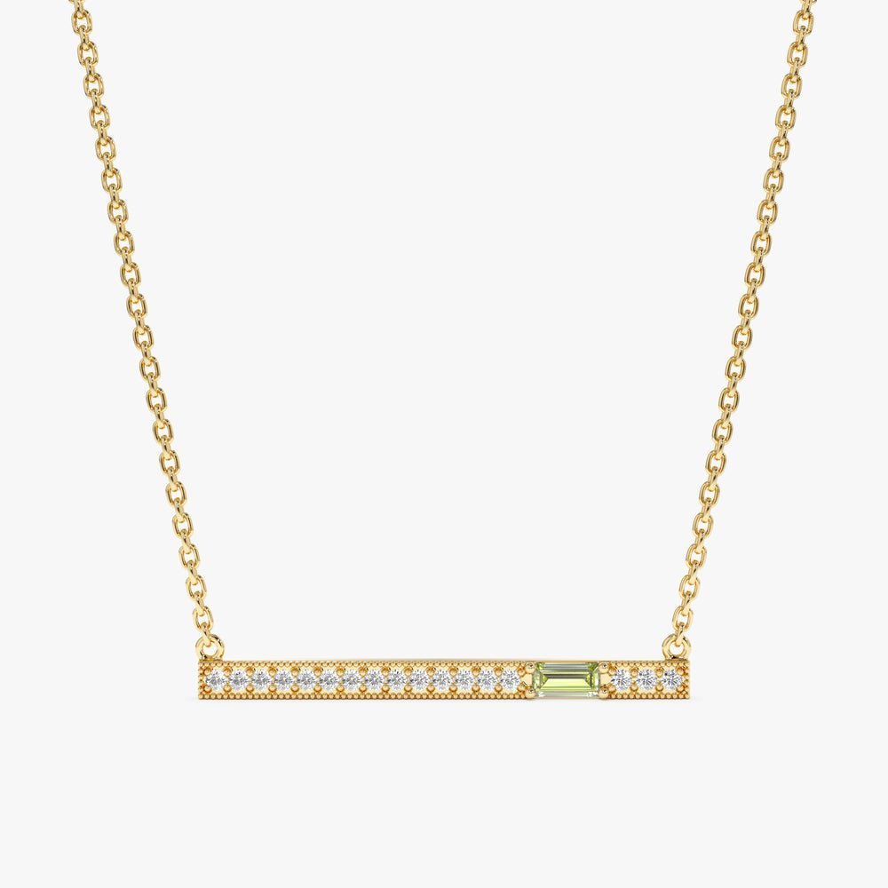 Whether worn as a standalone statement piece or layered with other necklaces for a personalized look, our Peridot Diamond Bar Necklace is sure to become a cherished addition to your jewelry collection.