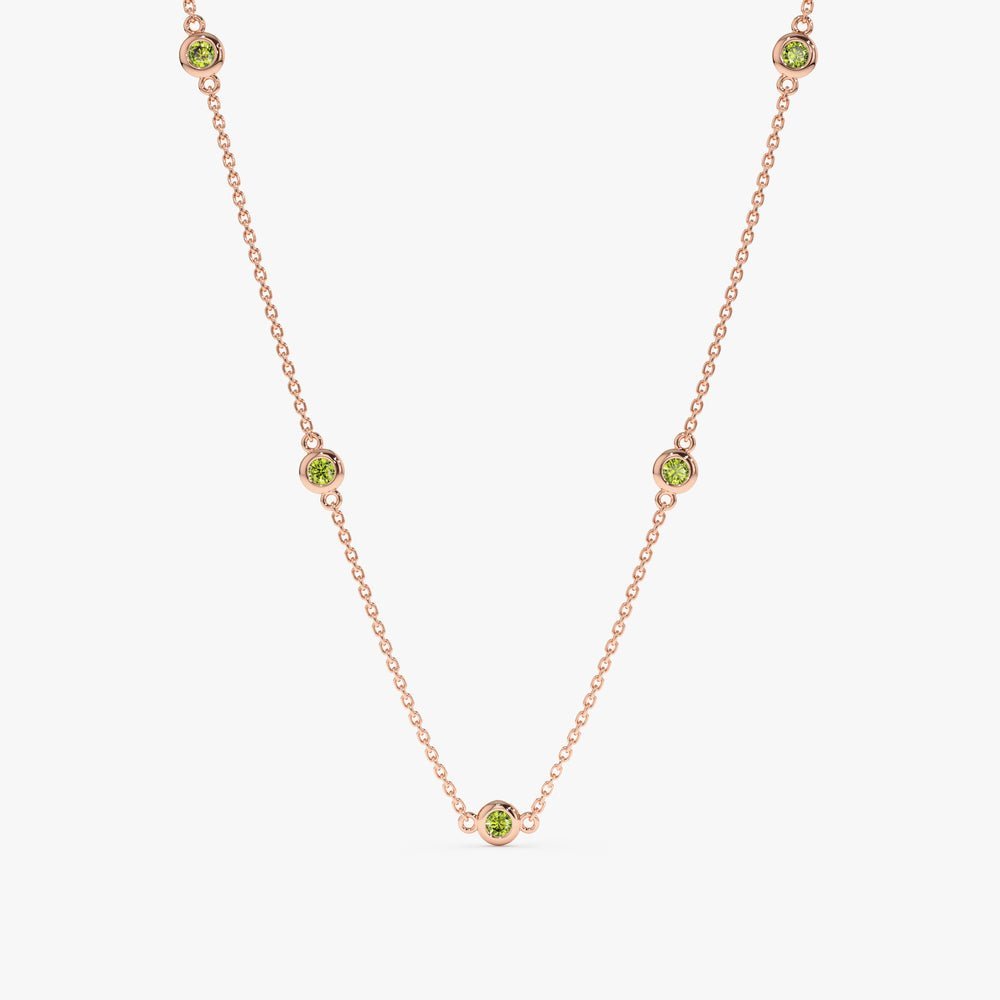A sleek 14K solid gold necklace featuring vibrant peridot stones in a station design, offering an elegant and timeless look for any occasion.
