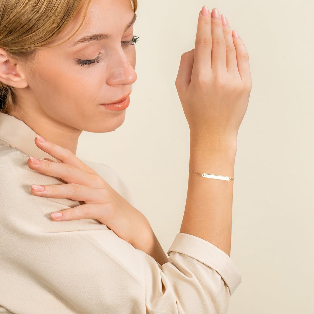 Handmade with precision craftsmanship, our Single Diamond Name Bracelet is a cherished keepsake that complements any outfit, from casual to formal. The dimension of the middle bar for a 4 mm name is 4 x 35 mm, creating a striking focal point on your wrist.