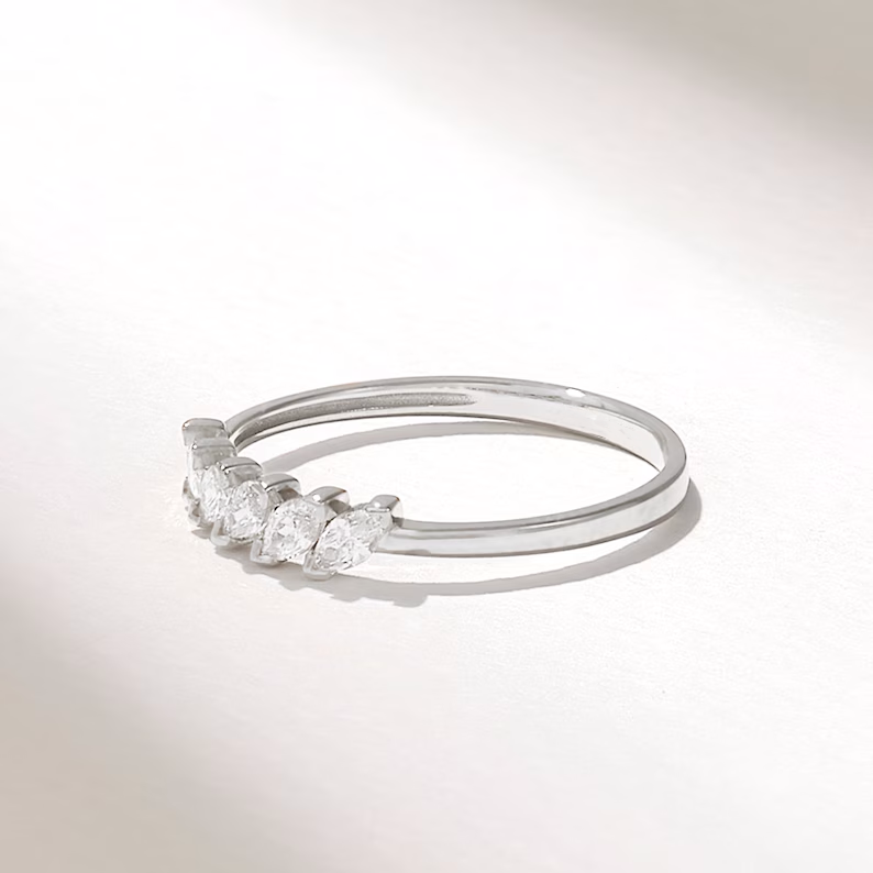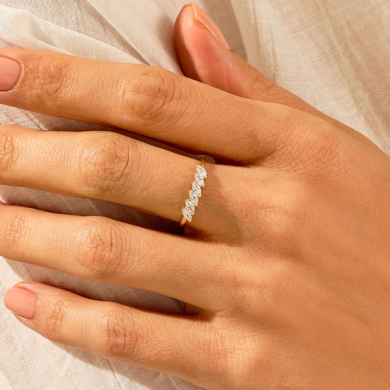 The ring features a stunning arrangement of lab-grown marquise diamonds, known for their graceful shape and superior brilliance. Each diamond is of D-E-F color grade and VVS1 clarity, ensuring a breathtaking sparkle with every movement. The total diamond weight of 0.32 ct adds just the right touch of luxury, while the delicate band—3.55 mm at the top, 1.60 mm in width, and 1.25 mm in thickness—creates a comfortable and refined fit.