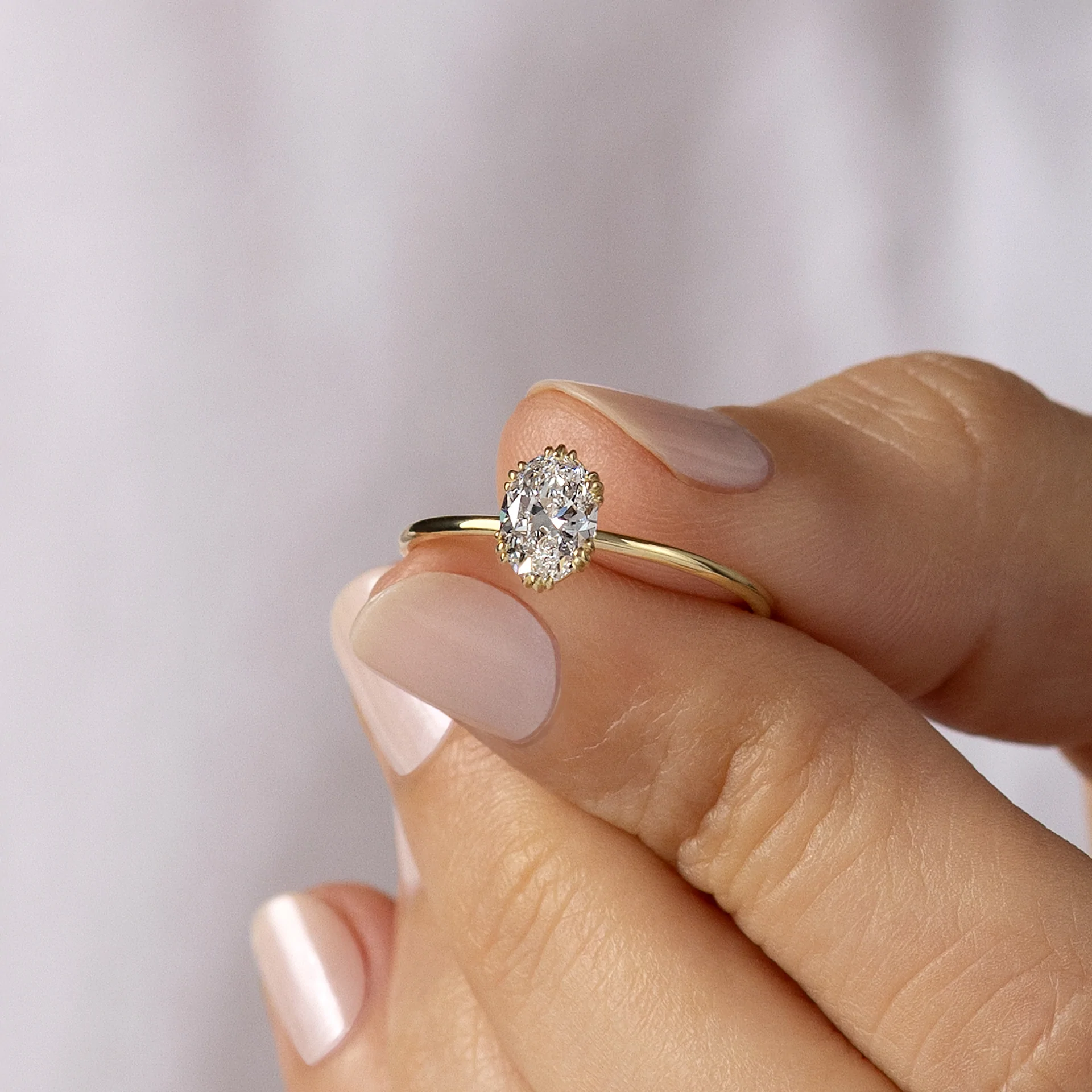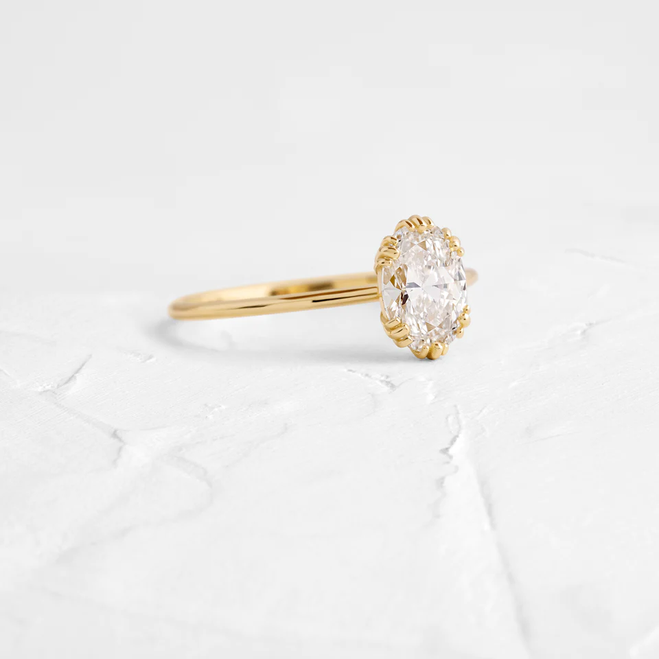 Made from 14K gold, the ring has a unique threaded band that gives a modern twist to a classic look. A brilliant oval cut moissanite diamond at its center is known for its high sparkle and fire.