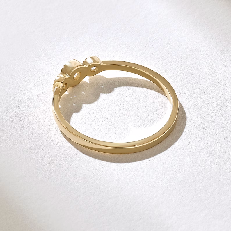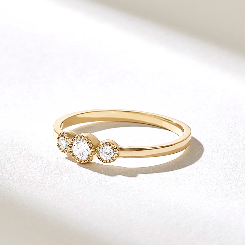 Set with three round-cut natural diamonds totaling 0.20 carats, each stone is hand-selected for its G-H color and VS-SI clarity, ensuring lasting brilliance and understated elegance. The bezel setting not only enhances the diamonds’ sparkle but also offers everyday comfort and protection—ideal for a modern bride or daily wear.