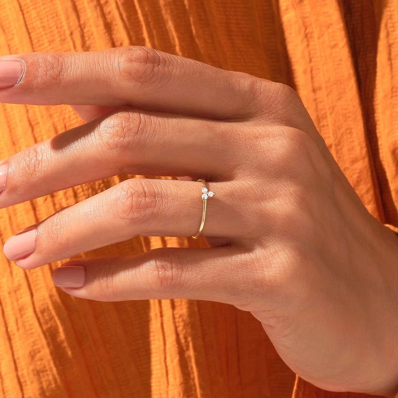 Delicate 14K gold trefoil promise ring with 0.06 ct GH VS-SI natural diamonds. Stackable, minimalist design. BIS Hallmarked & GIA certified.