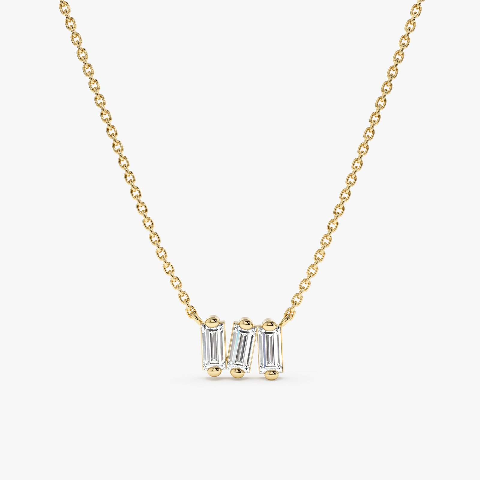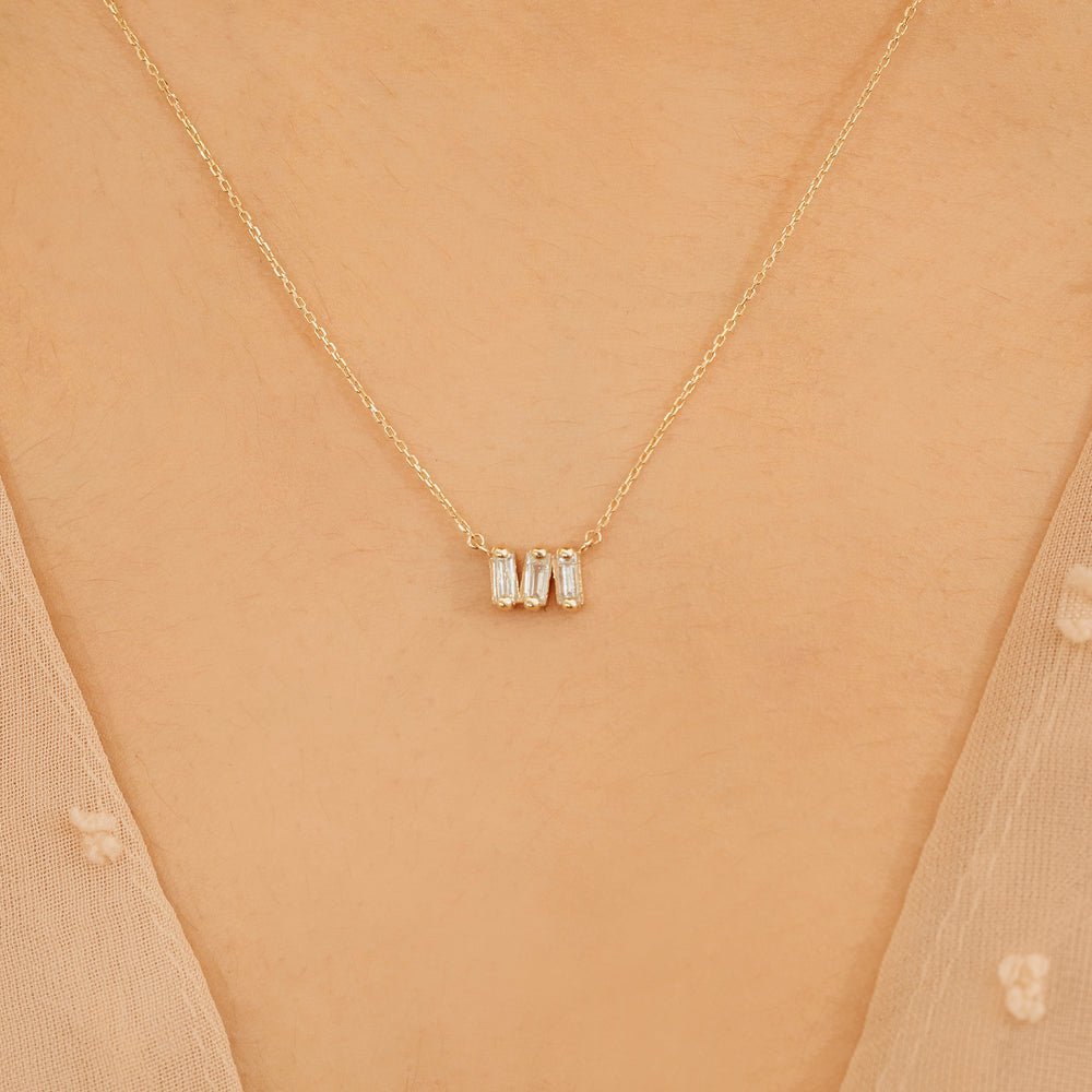 Embrace understated elegance with our Triple Baguette Diamond Cluster Necklace, featuring three sparkling baguette diamonds in a sleek 14k gold setting
