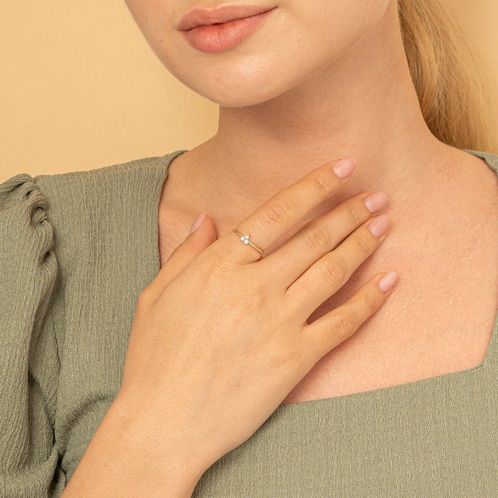 The dainty 1.4 mm band is crafted in solid 14K gold, available in your choice of yellow, white, or rose gold. The 4.5 mm cluster arrangement sits delicately atop the band, making it ideal for stacking or as a standalone statement ring. Its fine craftsmanship ensures a comfortable fit while offering subtle luxury and lasting durability.