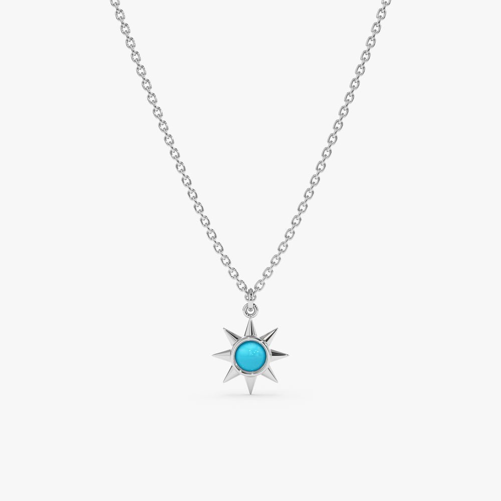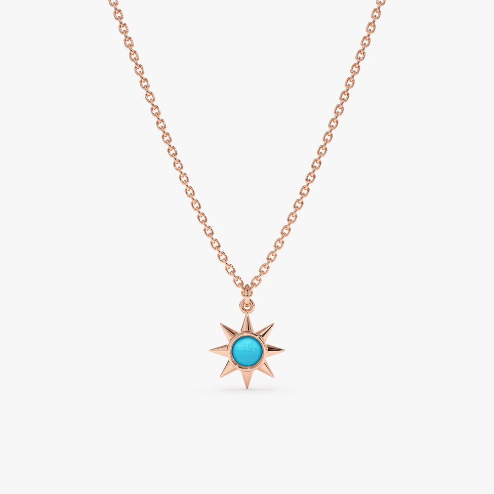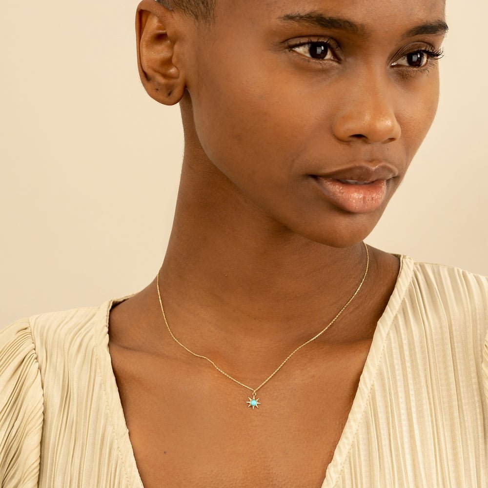 Our Turquoise Sun Necklace features a radiant sun pendant crafted from solid 18k gold, with a stunning natural turquoise gemstone centerpiece.