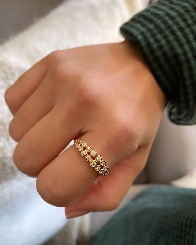 14K Solid Gold Set of 3 Natural Diamond Honeycomb Ring