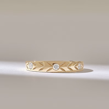 Vintage-inspired 14k gold leaf wedding band with flush-set natural diamonds (0.06 ctw) in an arrow pattern. BIS & GIA certified.