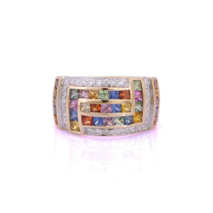 大胆的 18k 纯金戒指,镶有三排鲜艳的多色蓝宝石——散发着光彩优雅的气质,具有引人注目的现代外观。