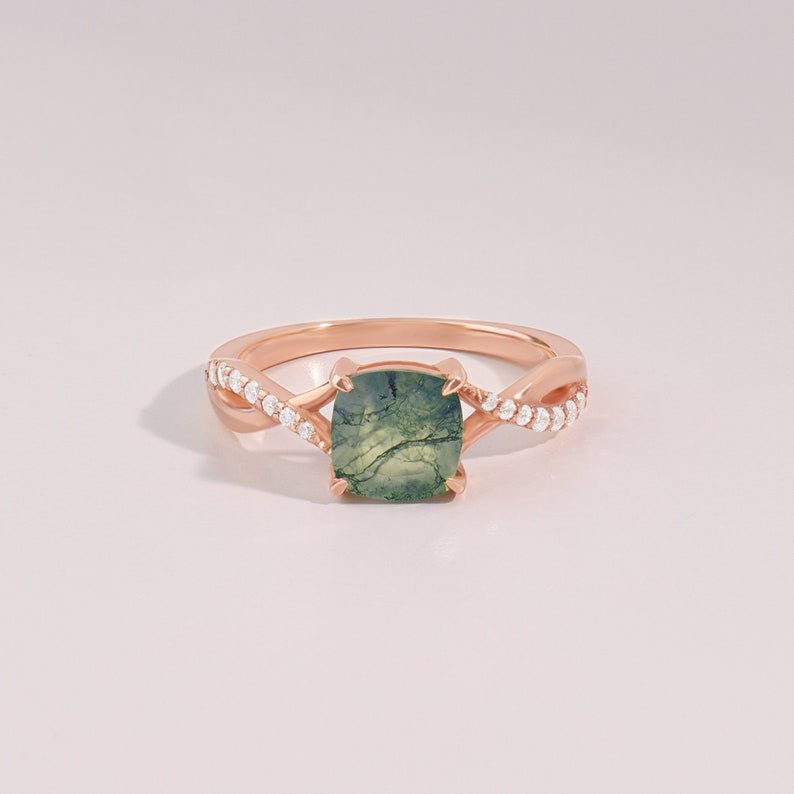 优雅的 14K 纯金枕形苔藓玛瑙订婚戒指,将自然之美与永恒设计相结合,是独特而有意义的爱情象征。