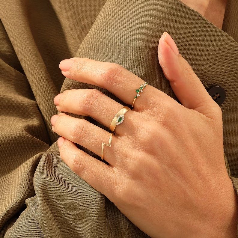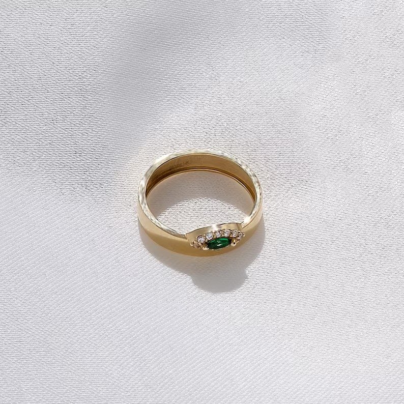 奢华的 14K 纯金戒指,镶嵌有榄尖形切割祖母绿,设计永恒而优雅,适合任何特殊场合。