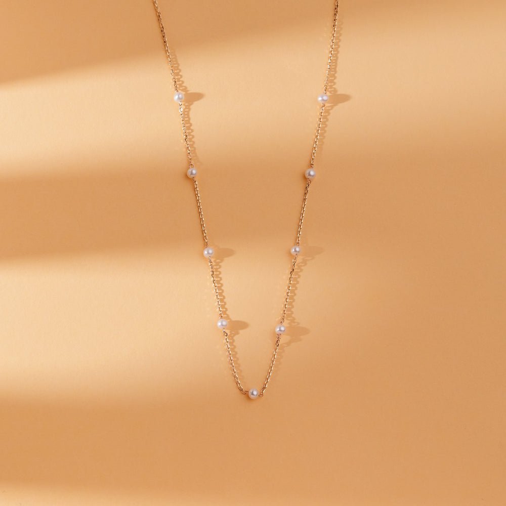 这款精致的项链采用纯金打造,缀以璀璨夺目的天然珍珠,每颗珍珠直径均为3毫米。珍珠的自然美态为任何造型增添一抹精致,无论休闲还是正式场合,这款项链都堪称完美之选。