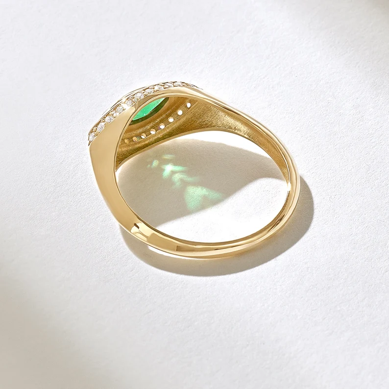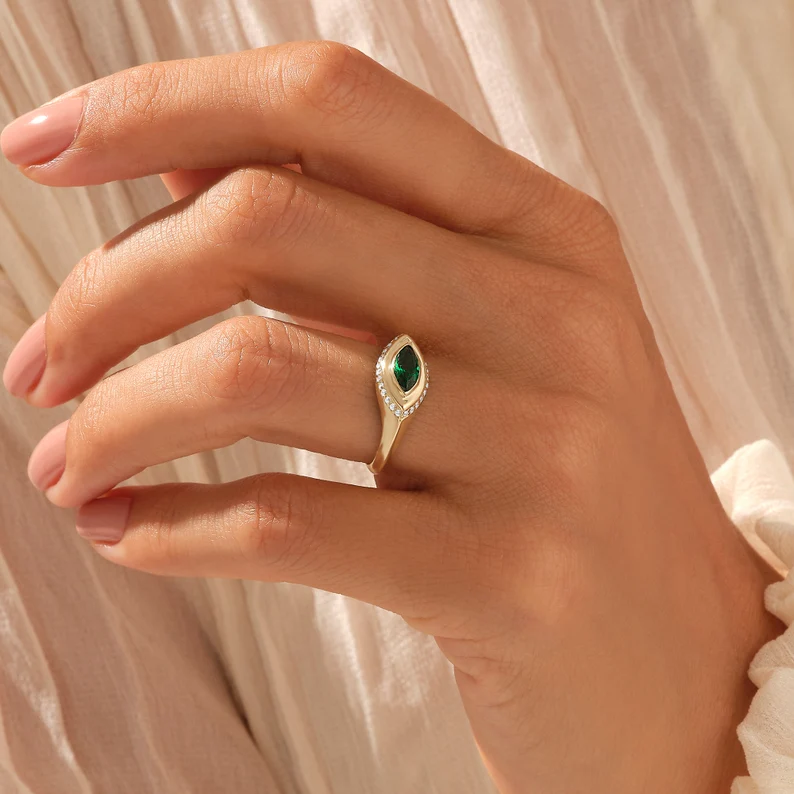 一枚引人注目的 14K 纯金戒指,饰有鲜艳的祖母绿邪恶之眼设计,既能提供保护,又能彰显优雅气质。