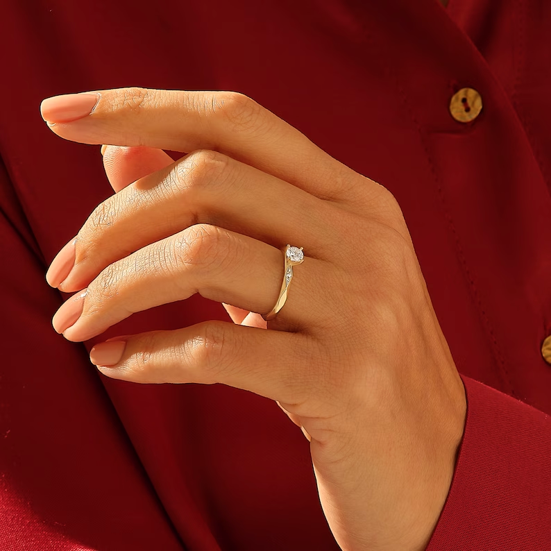 14K 纯金琢面戒托单颗钻石戒指 | 0.3CT 圆形订婚戒指 | 14K 纯金戒指