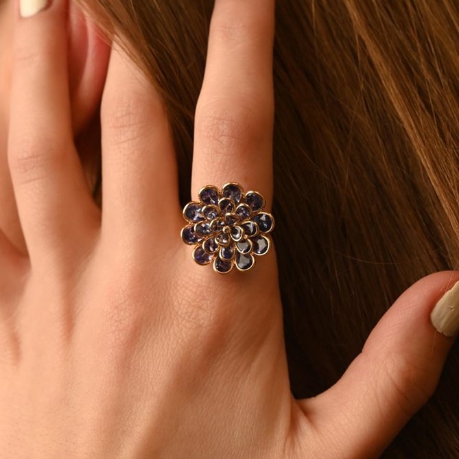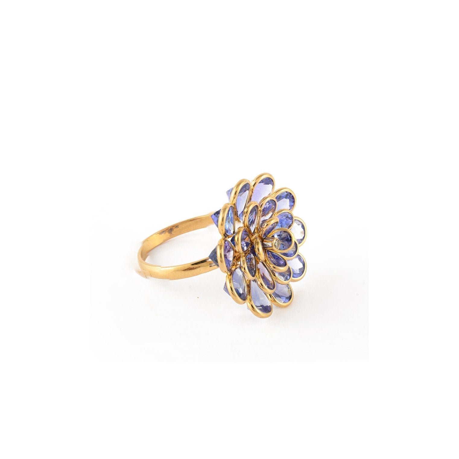 "(《世界人权宣言》) 14K 纯金坦桑石和钻石簇戒指 是一件令人叹为观止的作品,将鲜艳的色彩与隽永的精致融为一体。这枚令人惊艳的戒指镶嵌着22颗梨形坦桑石,每颗尺寸从6 x 4毫米到4 x 2.5毫米不等,总重达6.25克拉。坦桑石以簇状排列,呈现出鲜艳夺目的深蓝色和紫色。