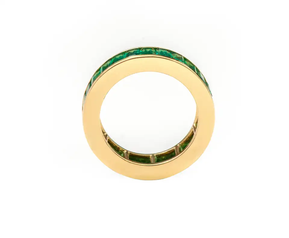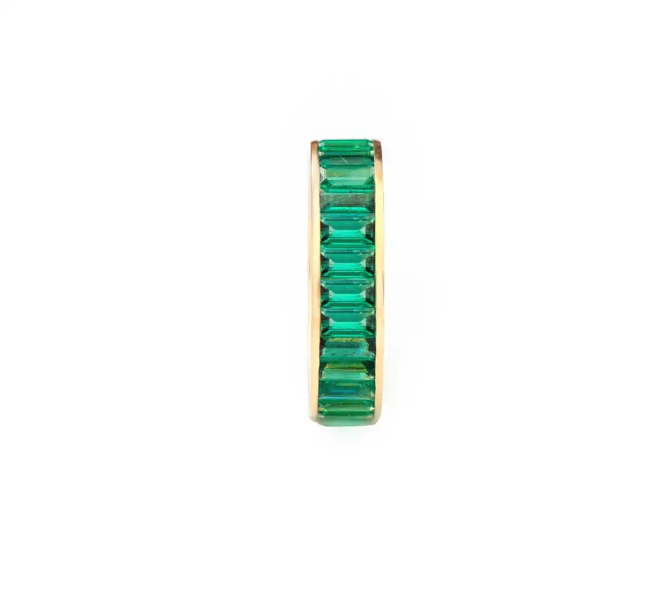 这 14k金祖母绿永恒戒指 这件精美绝伦的杰作,颂扬着天然祖母绿的永恒之美。这枚精致的戒指,镶嵌着一排重达5.39克拉的长方形切割祖母绿,镶嵌在一枚奢华的14K纯金戒圈上。